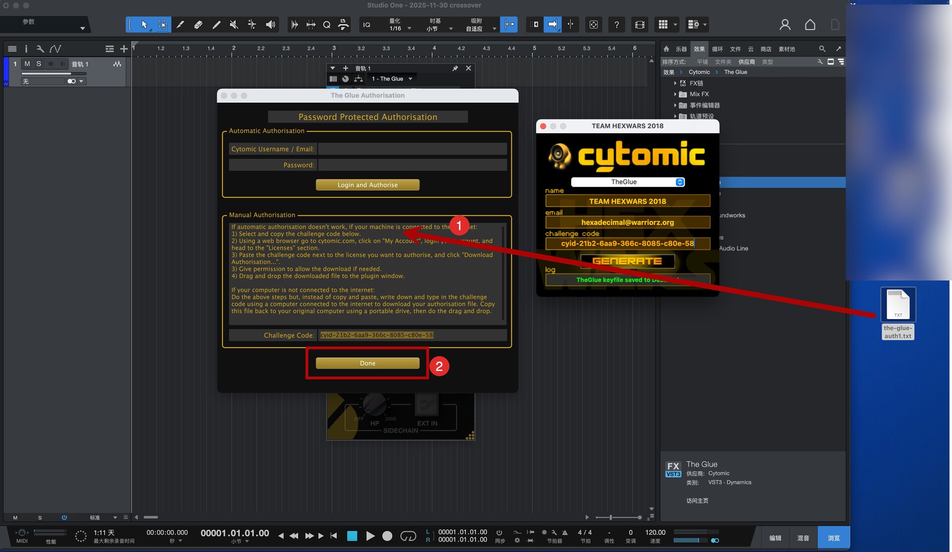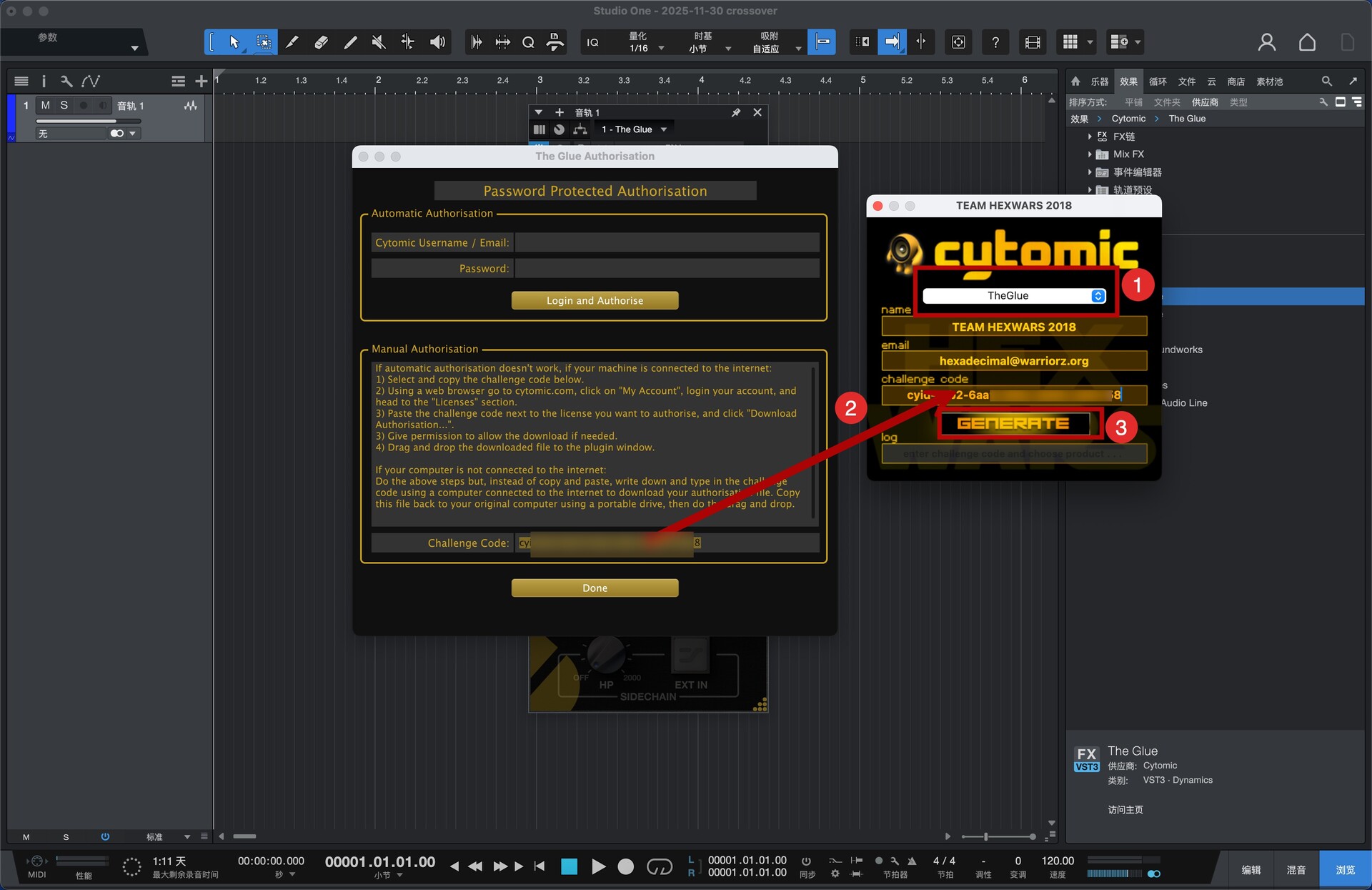 按照步骤选择The Glue,将注册页面中的注册码复制到注册机中,点击GENERATE