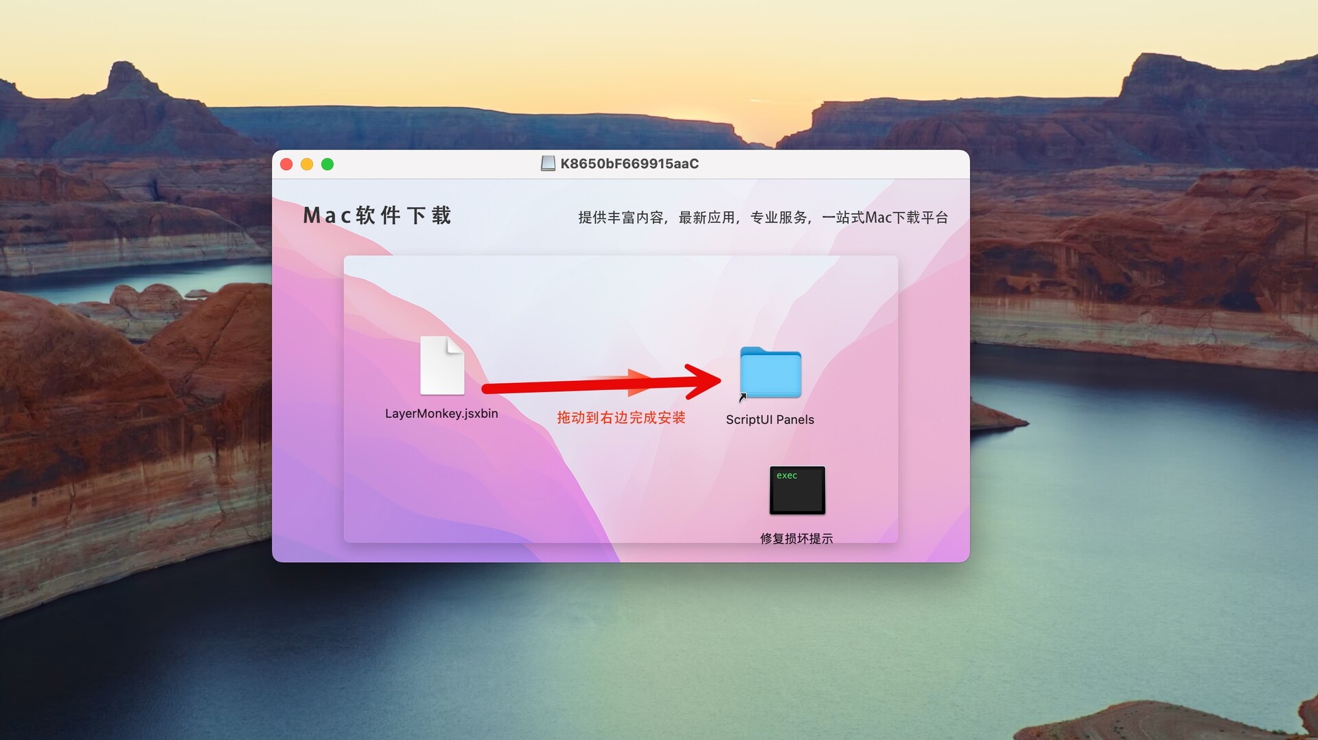 将左侧的“LayerMonkey.jsxbin”拖拽至右侧“ScriptUI Panels”文件夹中,如下图: