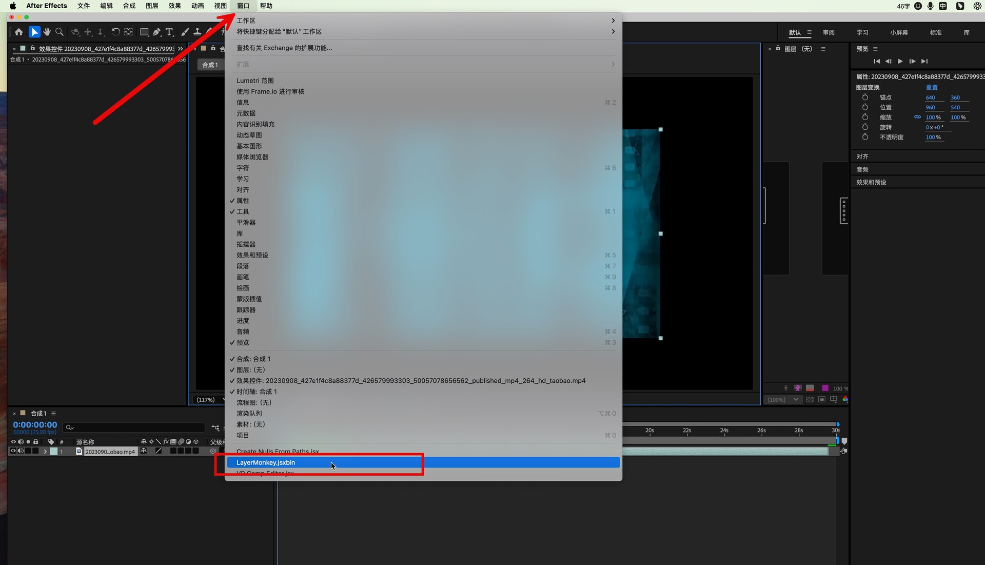 运行ae mac版,在菜单栏的窗口中就能找到安装好的ae脚本LayerMonkey了