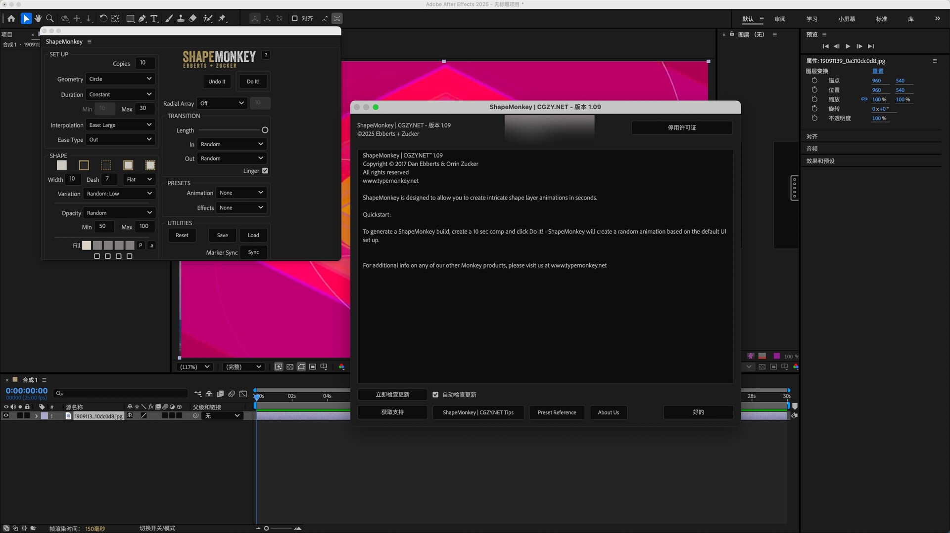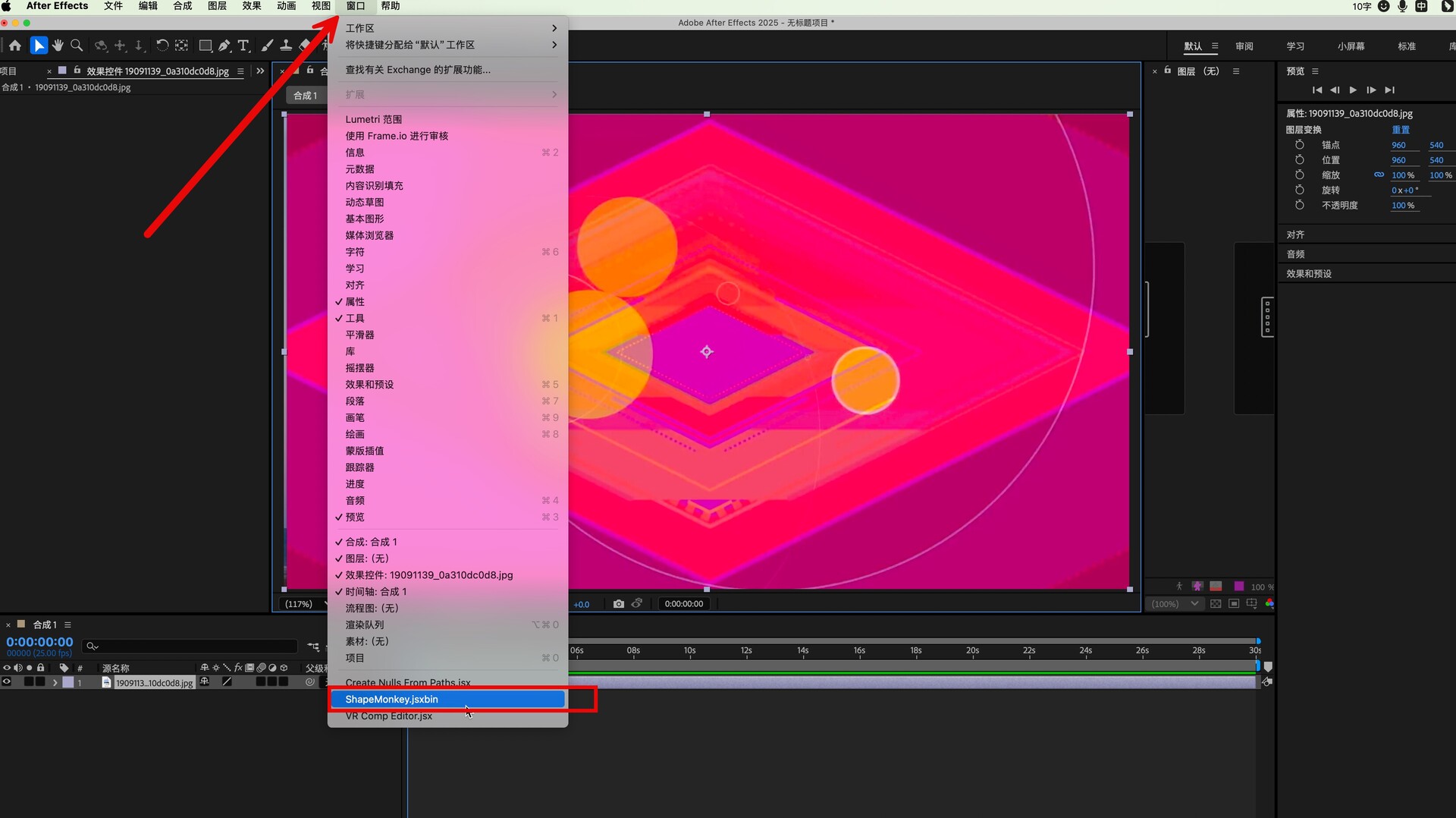 运行ae mac版,在菜单栏的窗口就拓展能找到安装好的ae插件ShapeMonkey 中文版了,如下图: