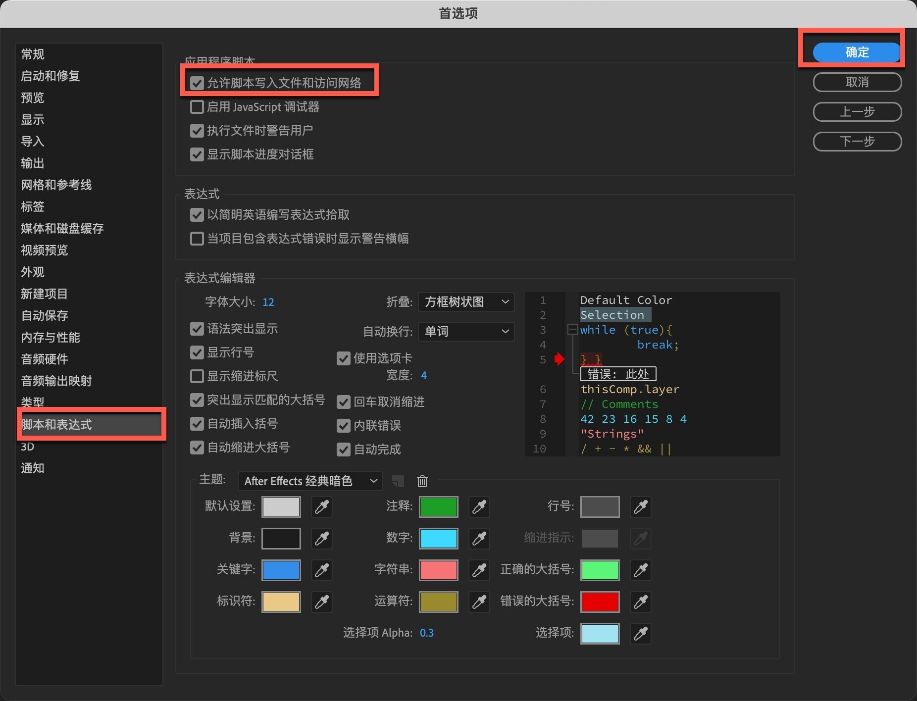 勾选允许脚本写入文件和访问网络,点击【确定】,如图: