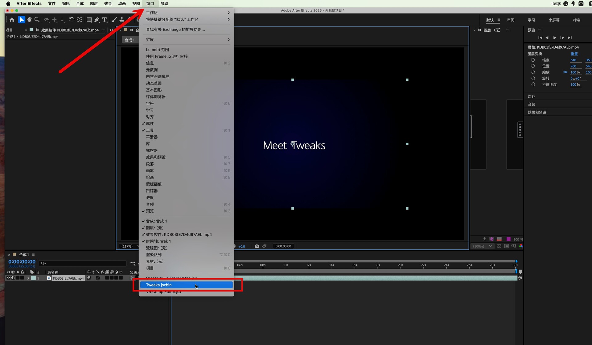 在AE顶部「窗口」菜单下即可看到 Tweaks .jsxbin 脚本。