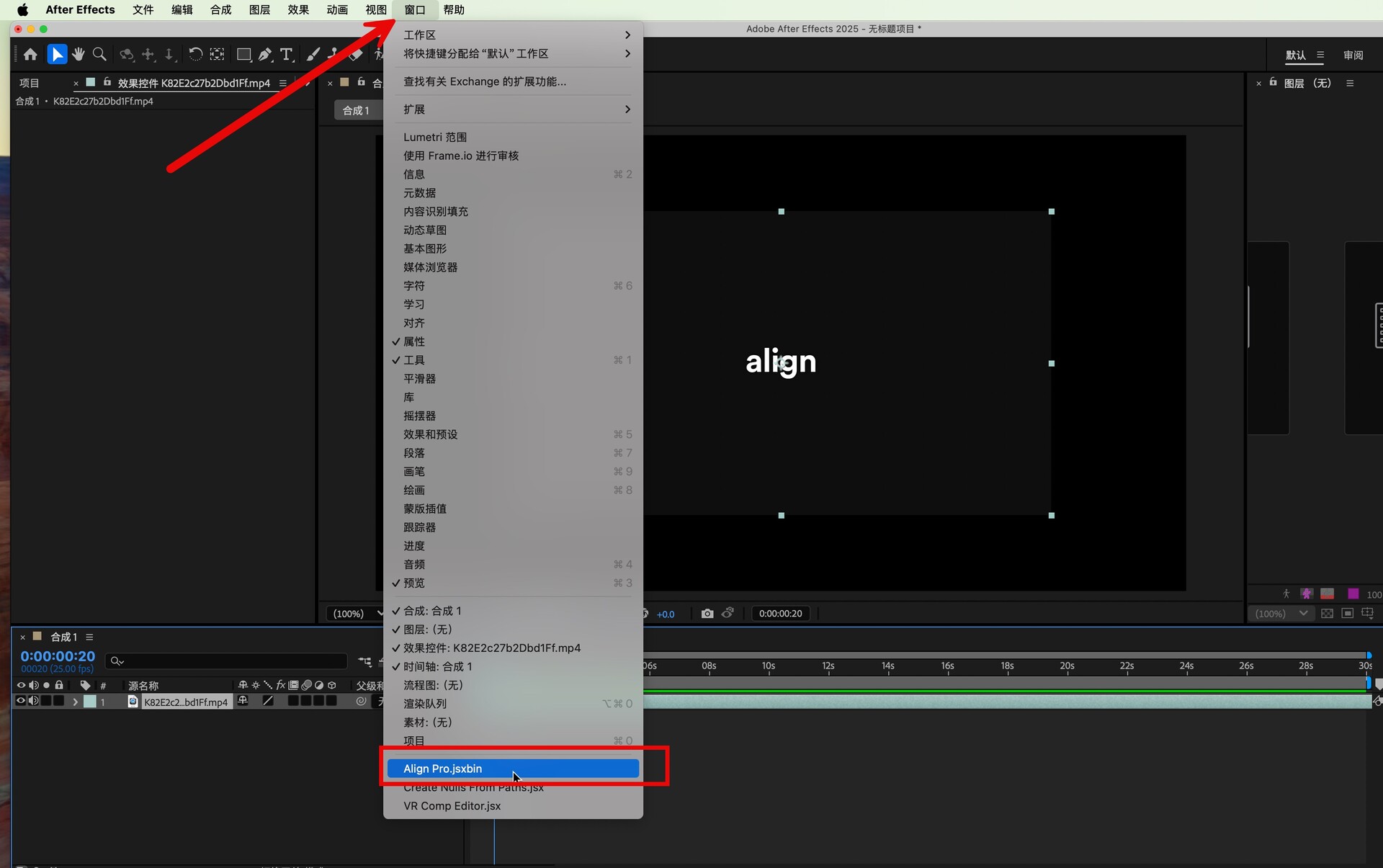 在AE顶部「窗口」菜单下即可看到 Align Pro 脚本。