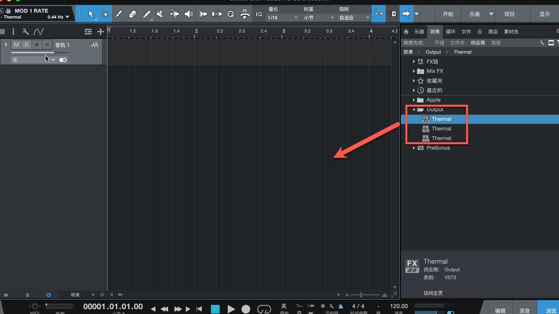 打开Studio One,在效果中可以找到安装好的插件,将插件拖到空白处即可使用