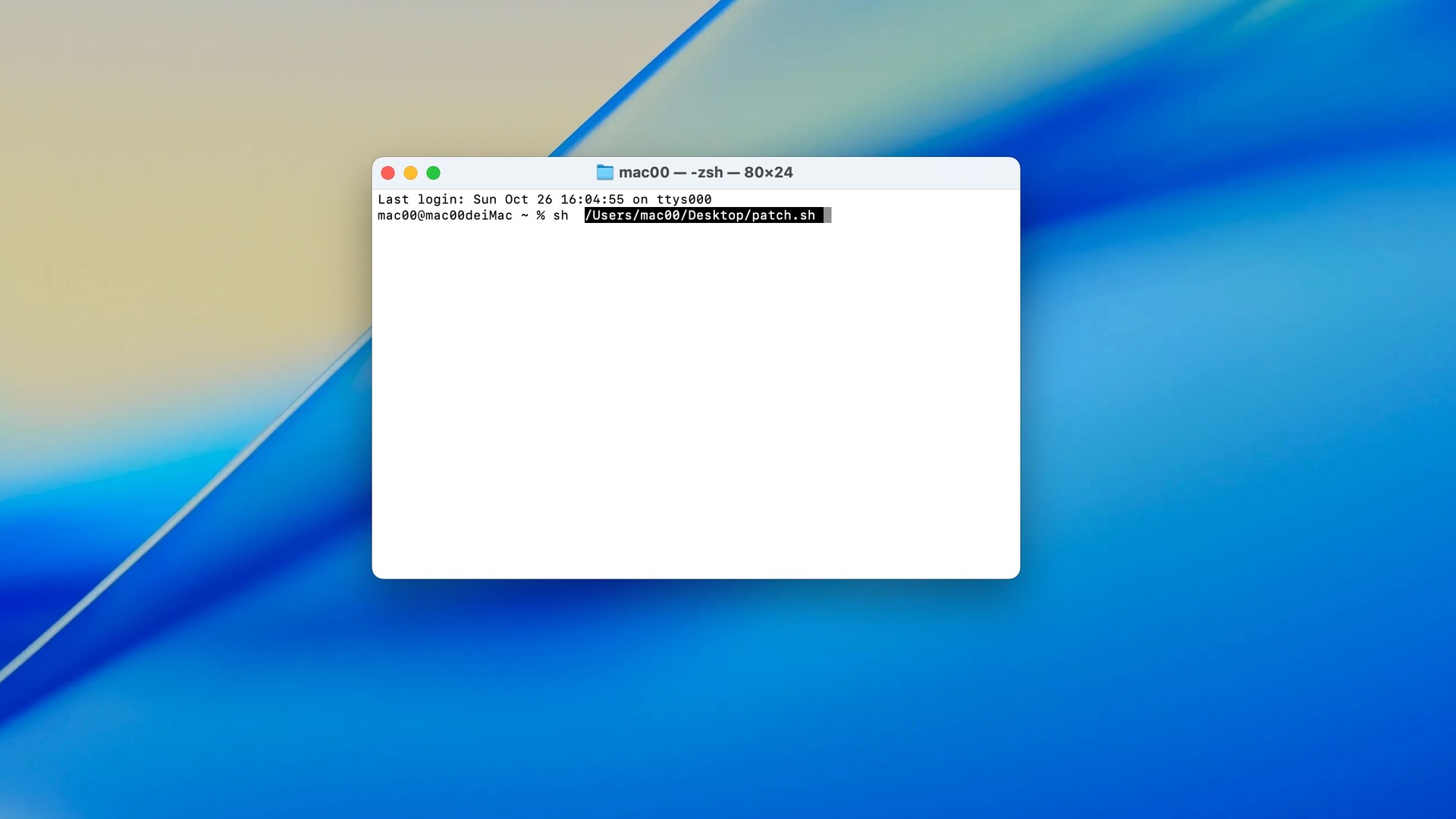 打开终端,输入sh 后面加空格,把patch.sh文件拖入终端,回车,输密码