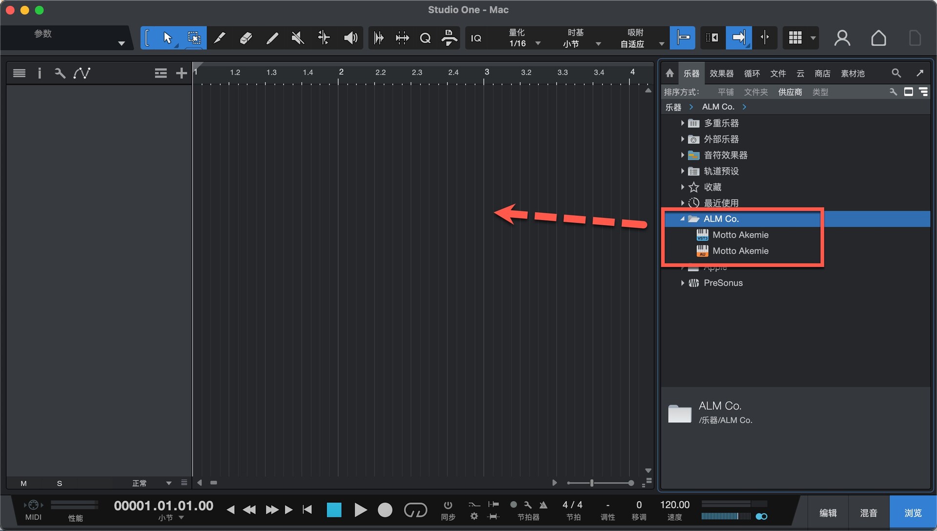 打开 studio one软件,在乐器-供应商即可找到安装好的插件,拖动到左侧空白处