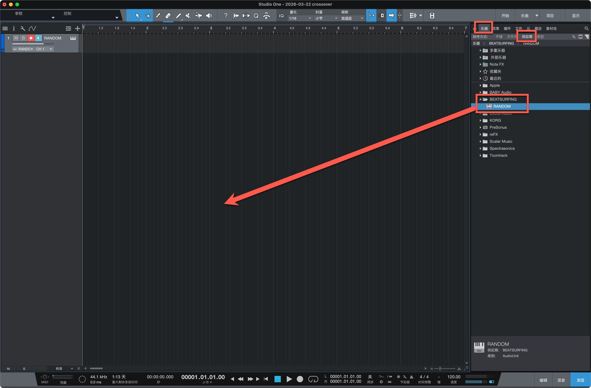 打开studio one,在乐器-供应商中就可以找到该插件,将插件拖动至左侧空处