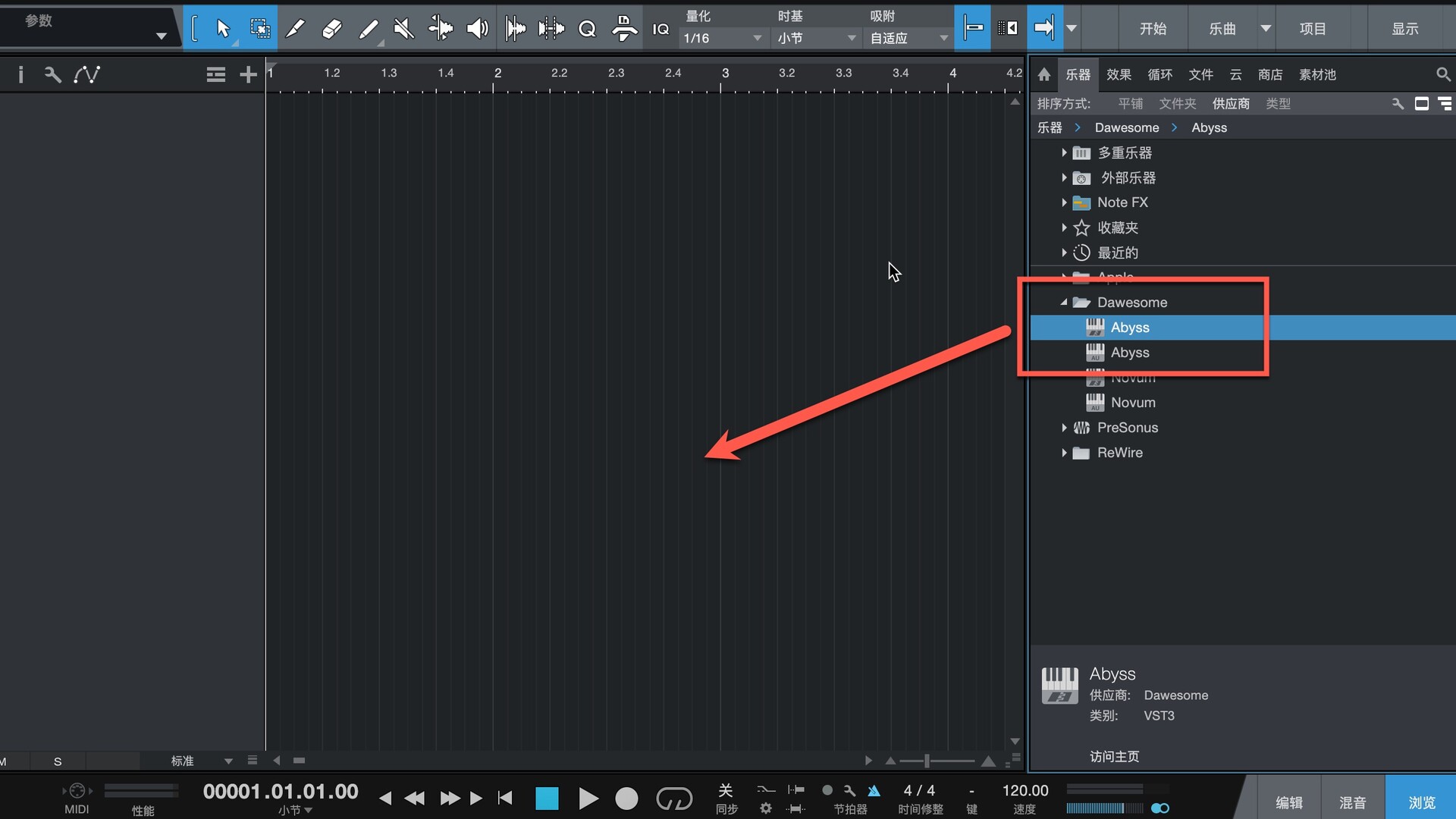 打开studio one,在乐器-供应商中即可找到安装好的插件,将插件拖动到左侧空白即可