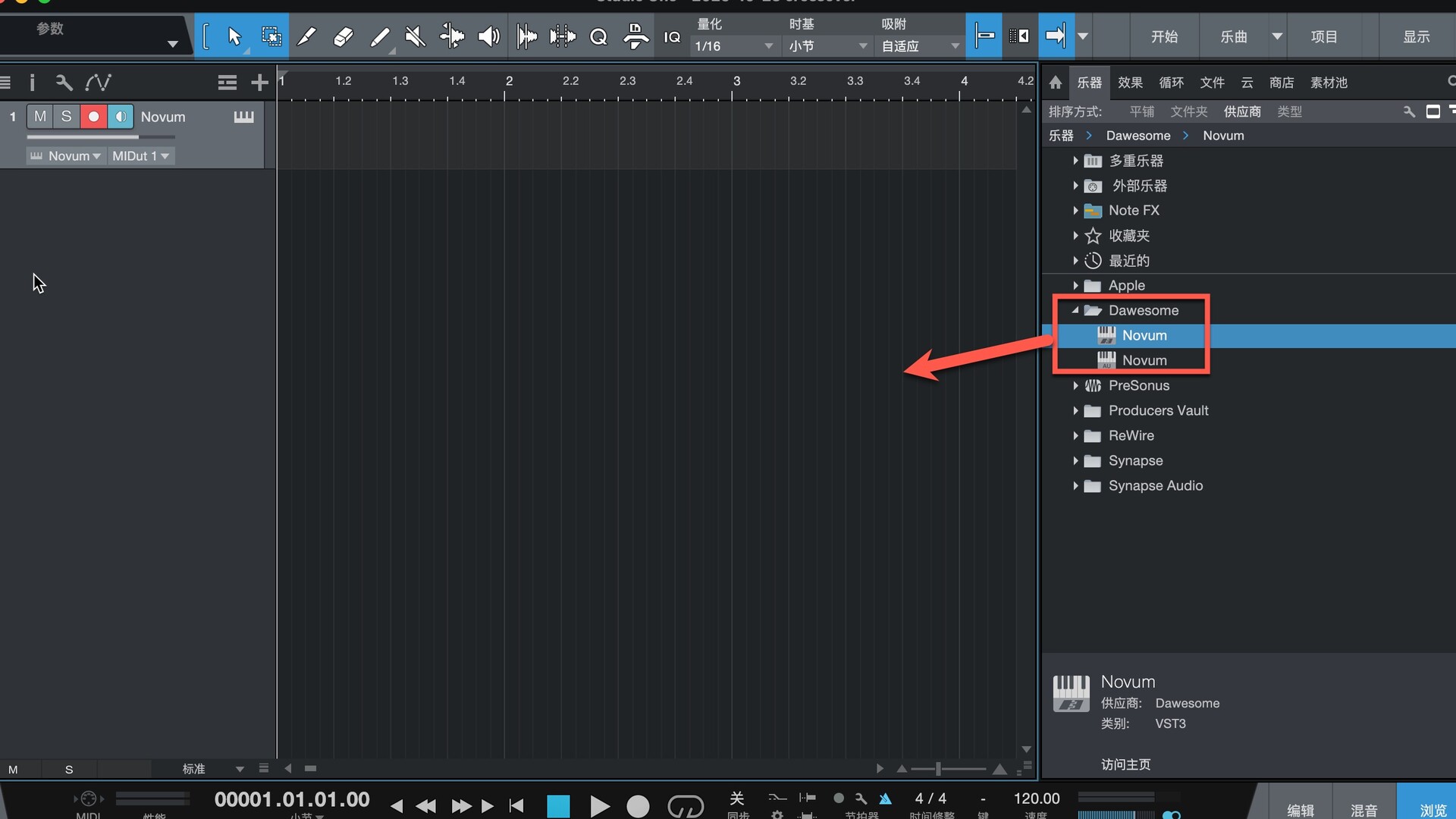 打开studio one,在乐器-供应商中就可以找到该插件,将插件拖动至左侧空白位置
