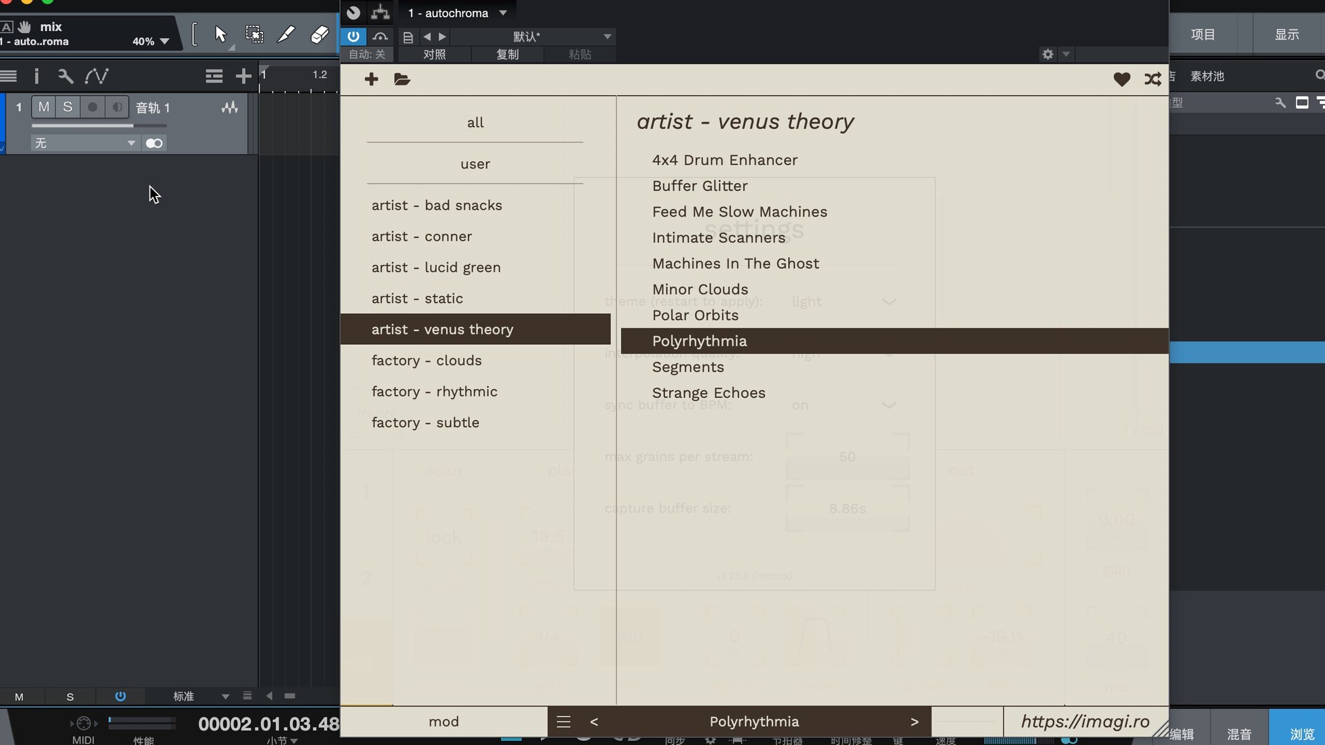 Imagiro Autochroma for Mac是一款独特的音频插件,专为音乐制作和音频处理而设计。它融合了粒子合成技术与多样化的音频效果,如鼓增稠、哇音、收音机效果、合唱以及混响等,为用户提供了丰富而独特的音频处理体验。这款插件的核心由三个不同引擎组成,每个引擎都具备独特的延迟操作和音高产生能力,同时提供粒子长度、包络运行速度和间距等调节选项。用户还可以通过四个调制器(包括包络跟随器、正弦波LFO、脉冲LFO以及宏调制器和随机调制器)协同工作,进一步扩展音频效果的可能性。无论是音乐创作还是音频后期处理,Imagiro Autochroma for Mac都能为用户带来无限可能的创意和灵感。