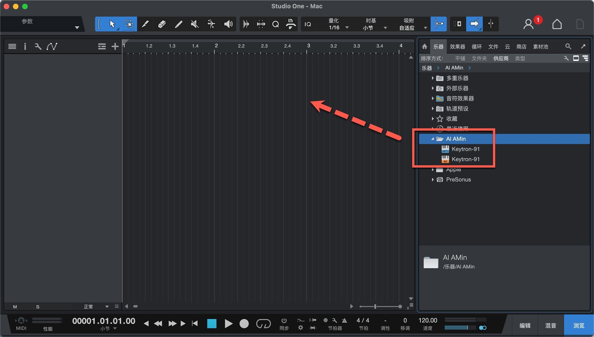 打开studio one,在乐器-供应商中即可找到安装好的插件,拖动到左侧