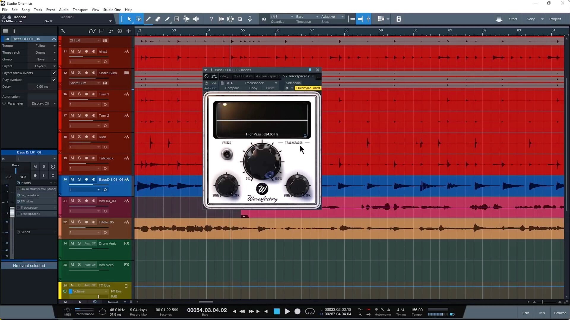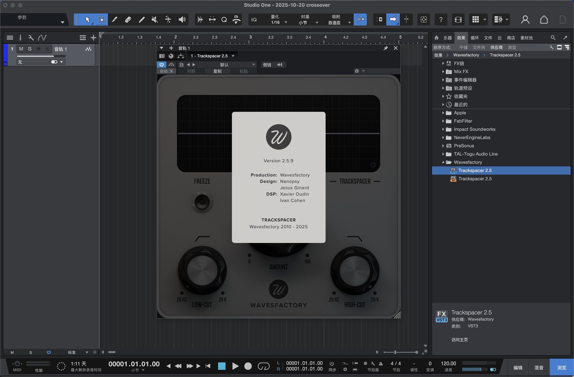 打开studio one,在效果器界面找到Wavesfactory Trackspacer,然后拉到studio one 界面,如图: