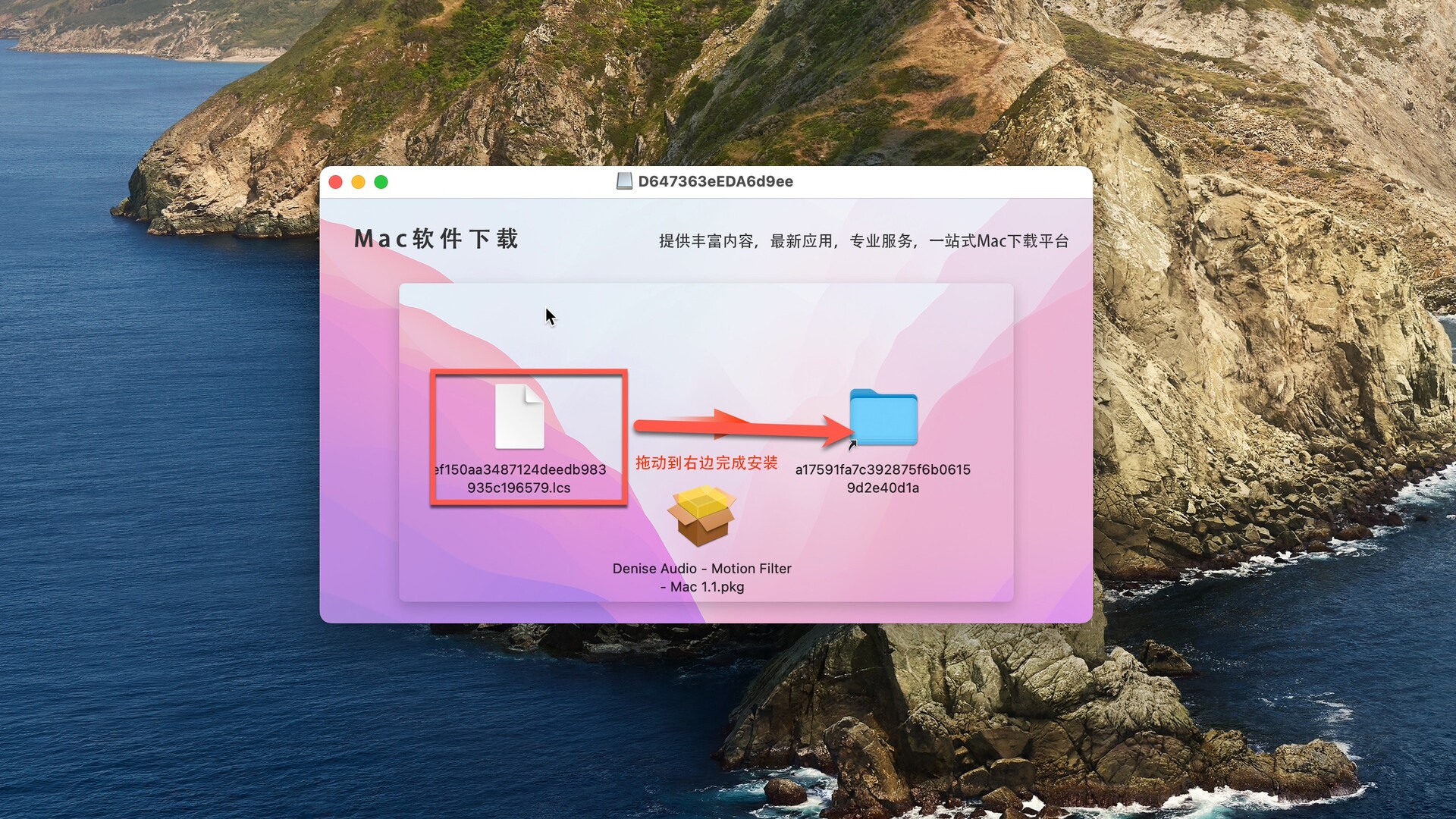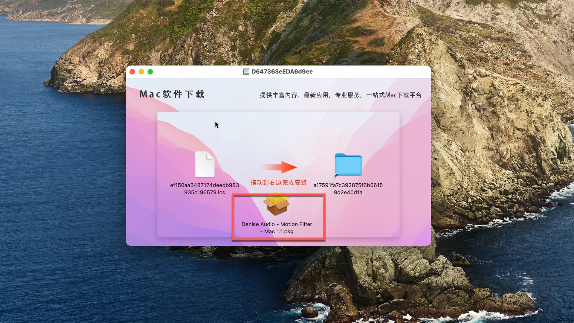 下载完成后,双击包内的Denise Audio Motion Filter.pkg点击继续进行安装