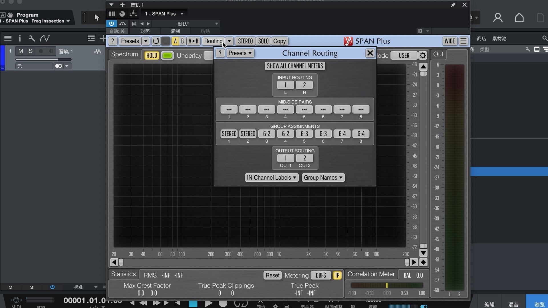 除了多轨频谱比较之外,SPAN Plus 还支持多通道分析,可以设置为同时显示来自两个不同通道或通道组的频谱。可以根据喜好选择频谱的颜色。SPAN