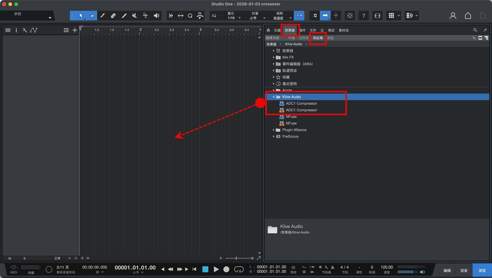 安装完成后打开studio one,在效果-供应商处找到安装好的插件,拖动到左侧工作区