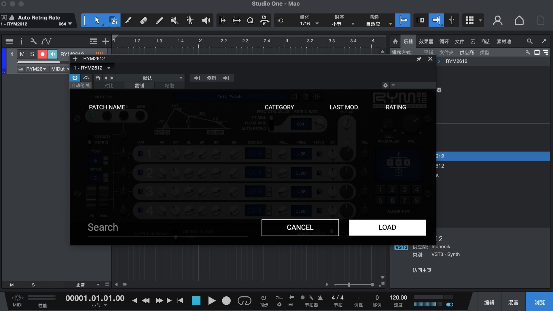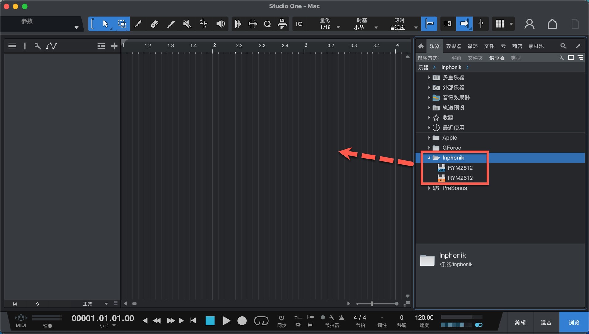 打开studio one,在乐器-供应商中找到Inphonik,将RYM2612拖动到左侧的空白处即可