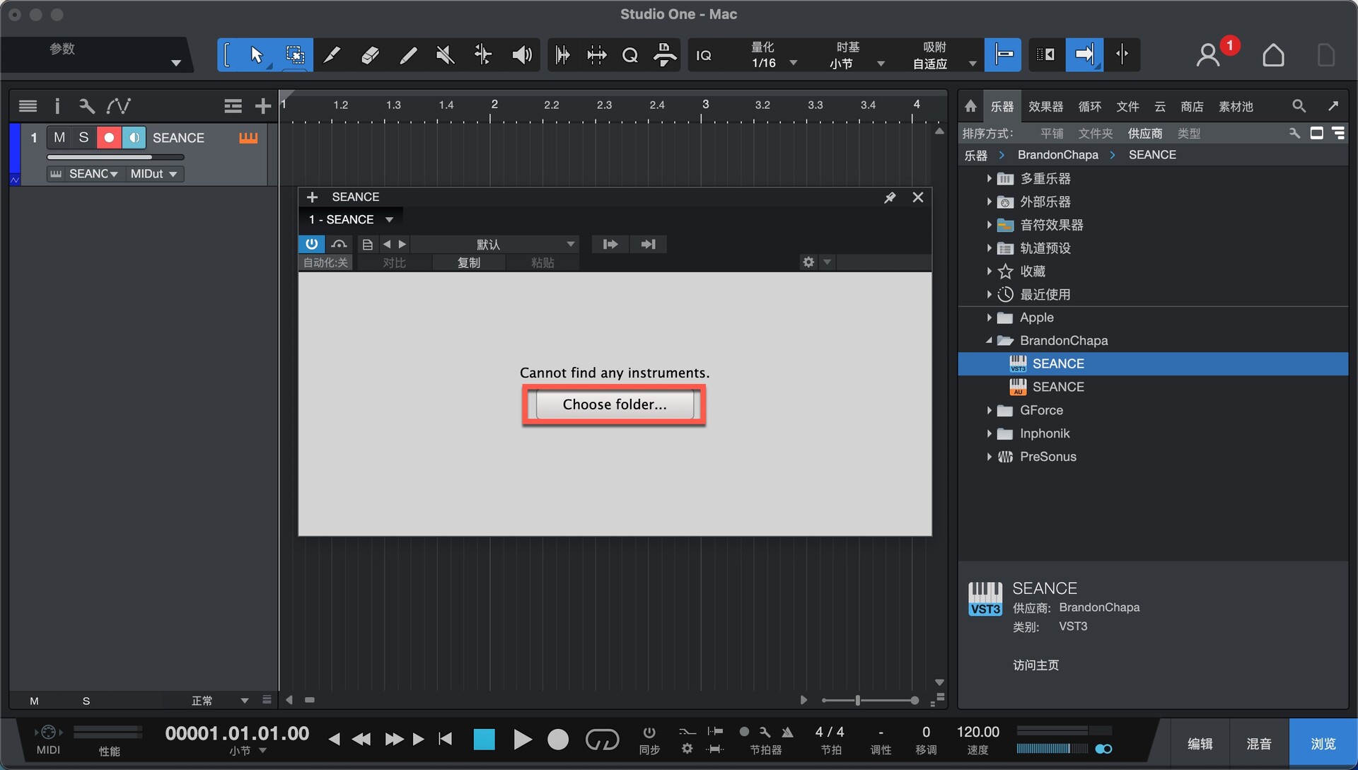 打开Studio One在乐器-供应商下即可找到插件,拖动到左侧空白位置