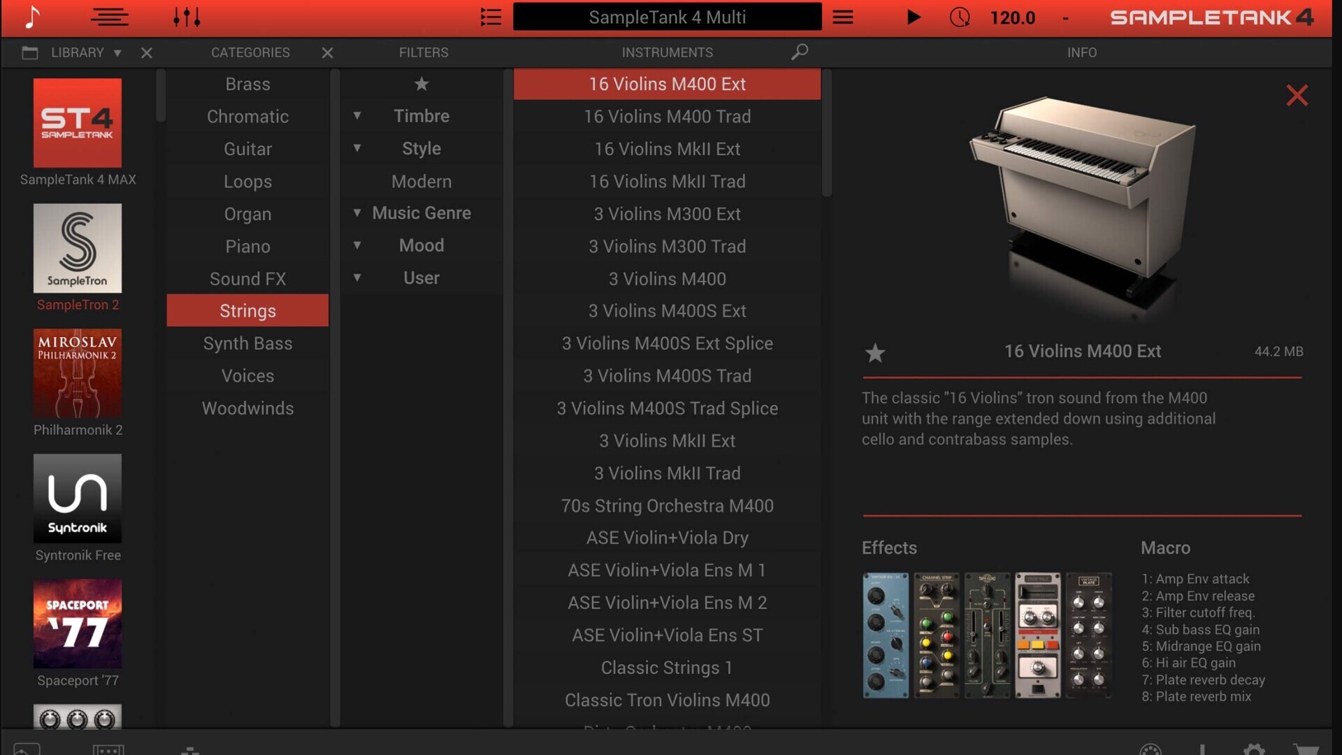 SampleTron 2 可作为独立应用程序或插件使用,也可用作SampleTank 4 * 中的库,以扩展其声音世界。在那里,您可以进行更深入的编辑,添加更多效果,并在多个 MIDI 通道上播放 3 轨 SampleTron 2 预设的多个实例,所有这些都具有我们流行的歌曲和凹槽工作站的便利性和处理能力。
