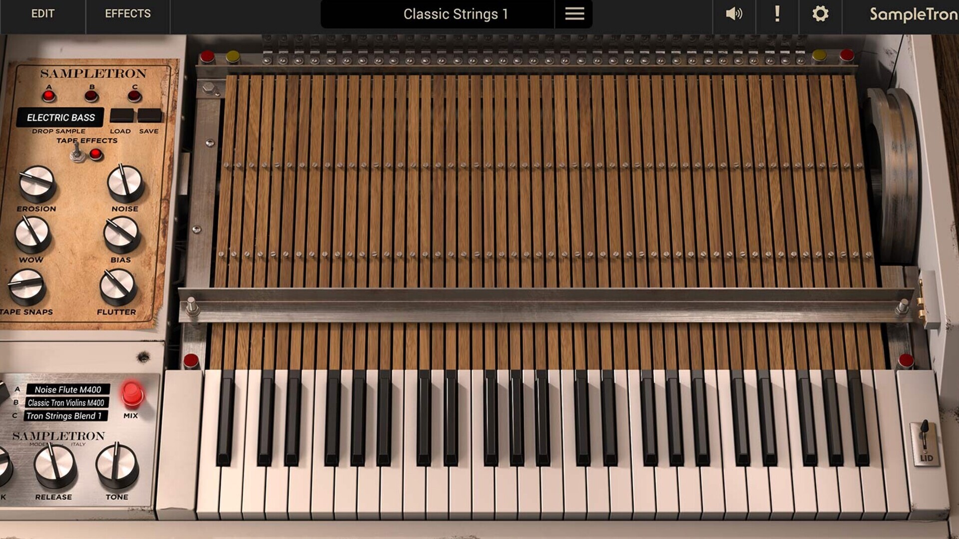 所有控件都直观易用,外观复古,但隐藏着一些突破性的工程设计。与原始的 Mellotron 硬件一样,每个预设都有三个可用音轨。您可以加载任何包含的音轨,而无需操纵音轨选择器来组合它们。
