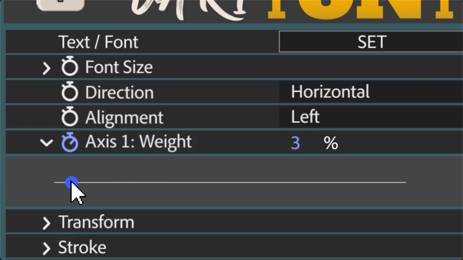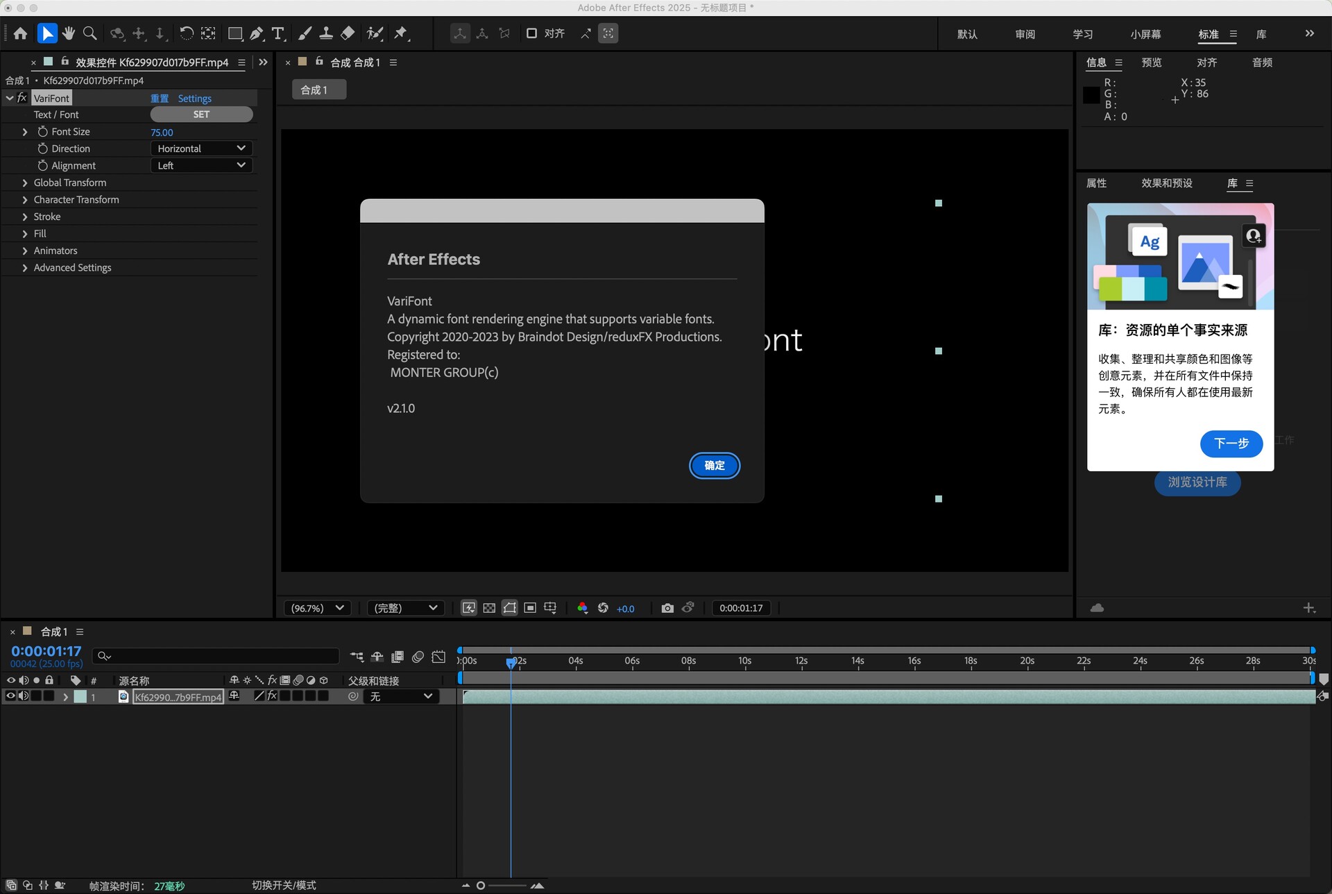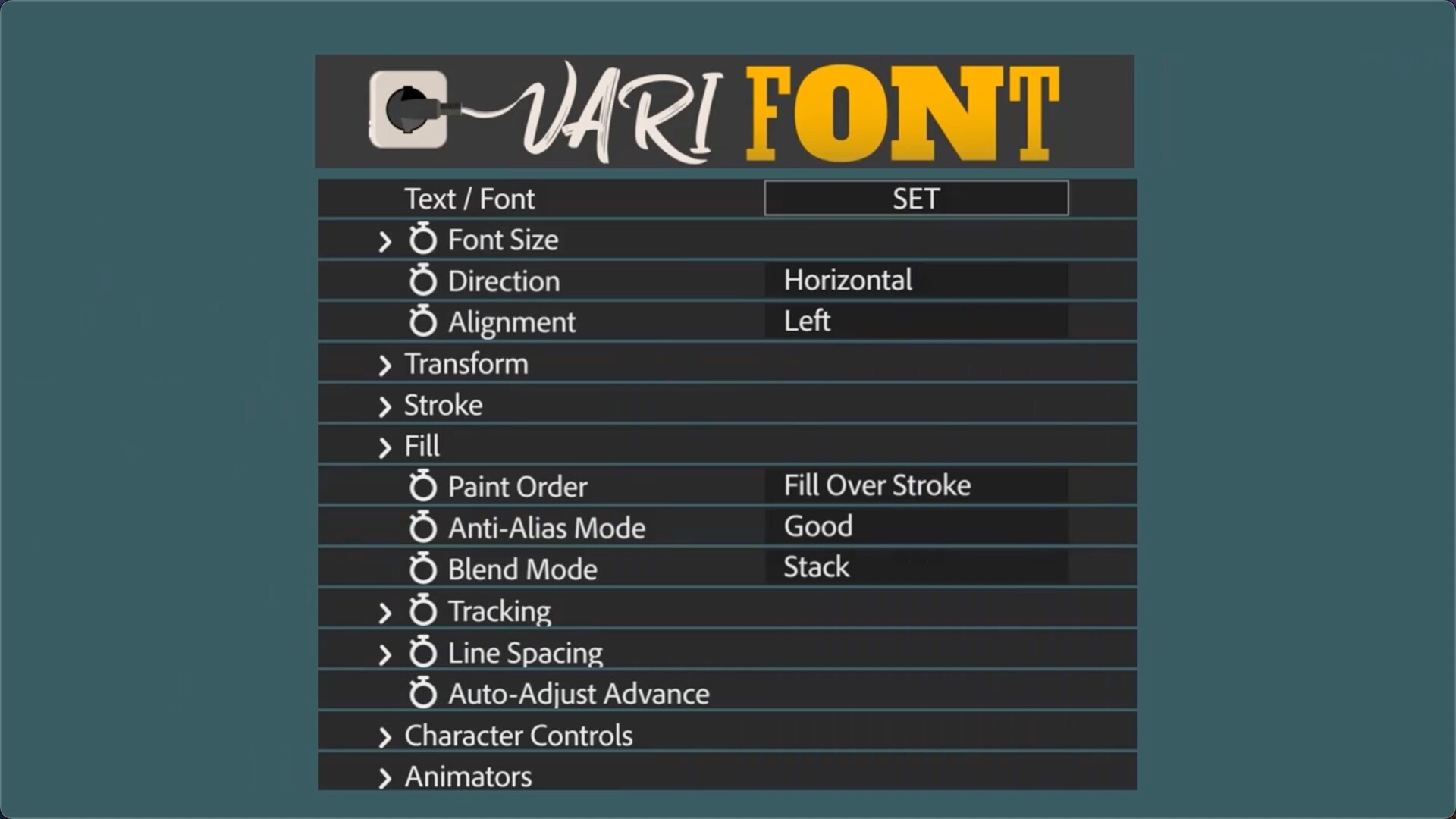 VariFont是一个原生插件,用于支持After Effects中的可变字体。插件可以在AE中将一些可变字体进行控制(貌似只支持英文字体),After Effects本身不支持VF,但是通过VariFont插件,您现在可以在After Effects中使用此技术。 主要优点之一是可以动态设置动画轴(例如粗细,宽度和倾斜度)。但是,我们不仅要提供基本的轴动画,而且还设计了“动画器”功能以允许范围选择,形状控制和随机性,我们认为这使该插件非常灵活和强大。