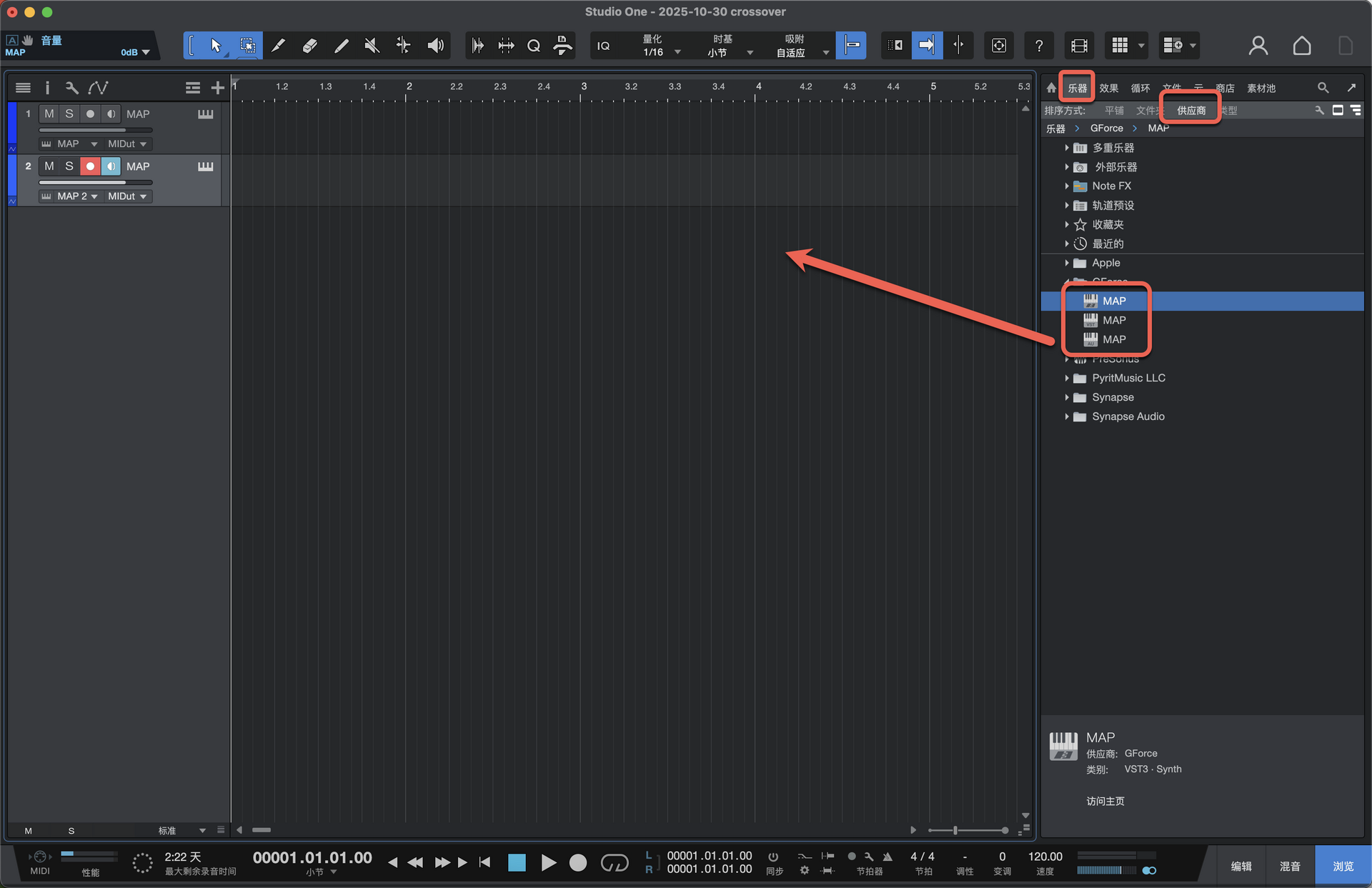 打开studio one,在乐器-供应商中就可以找到该插件,将插件拖动至左侧空白位置