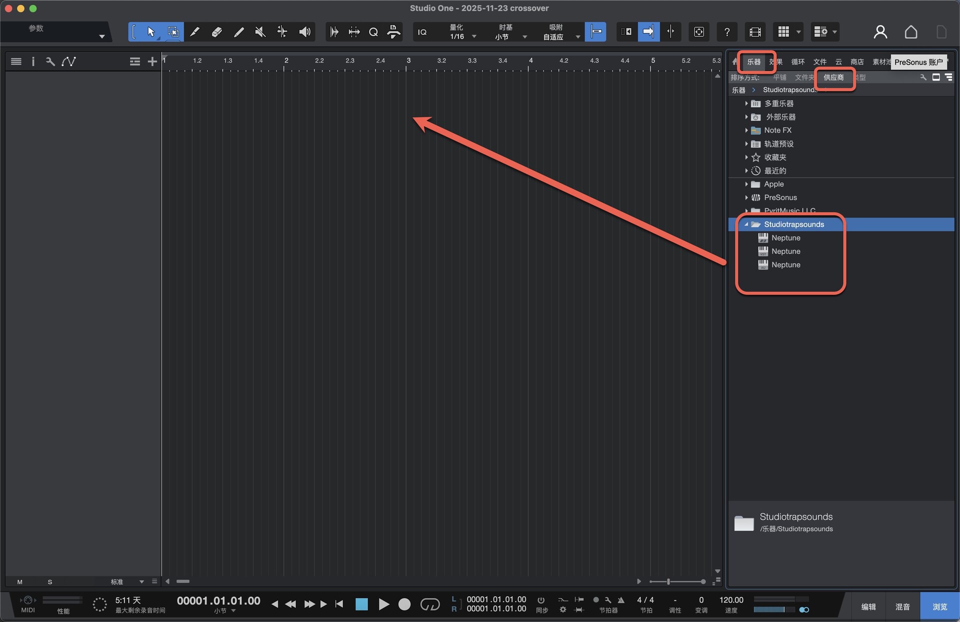 打开Studio One,在乐器—供应商中找到安装好的插件,拖到软件空白处