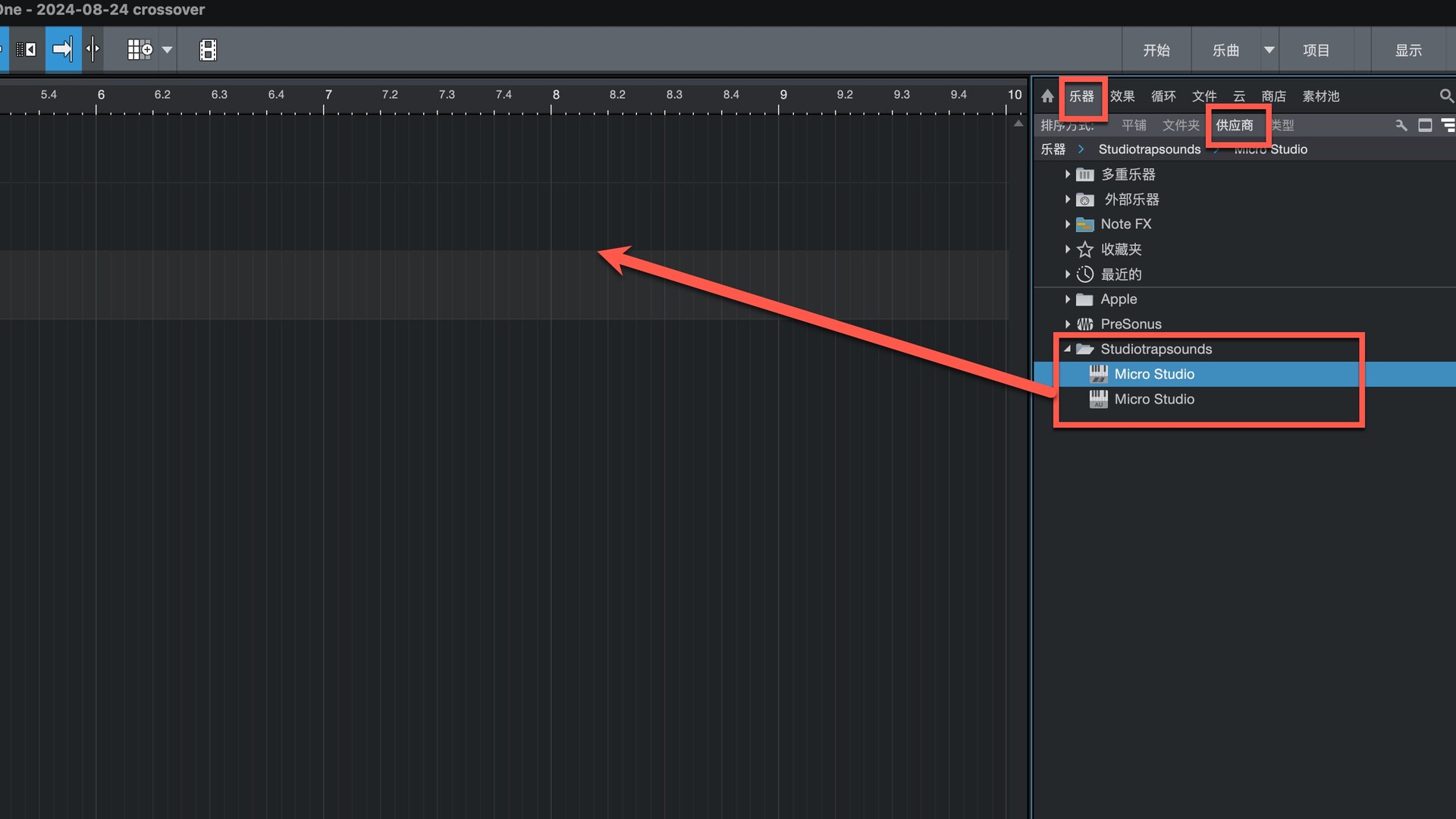 打开studio one,在乐器-供应商中即可找到安装好的插件,拖拽插件至左侧窗口即可打开插件