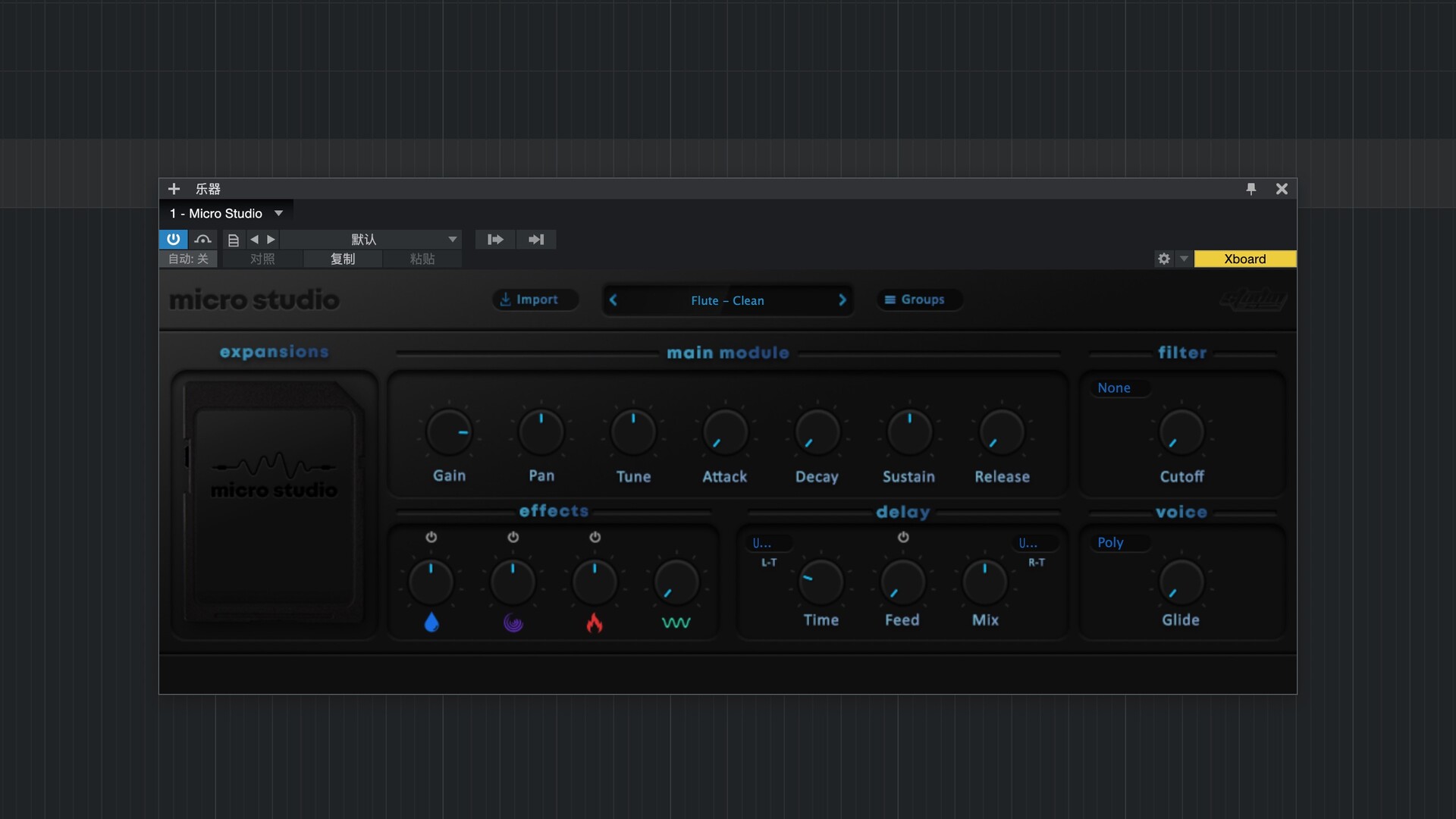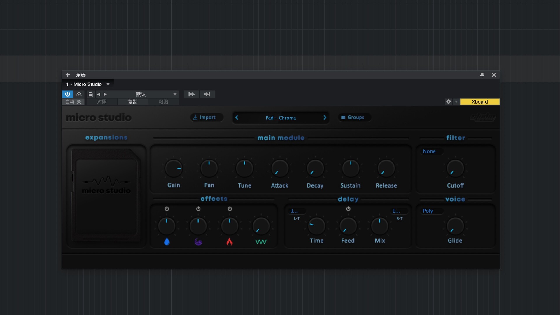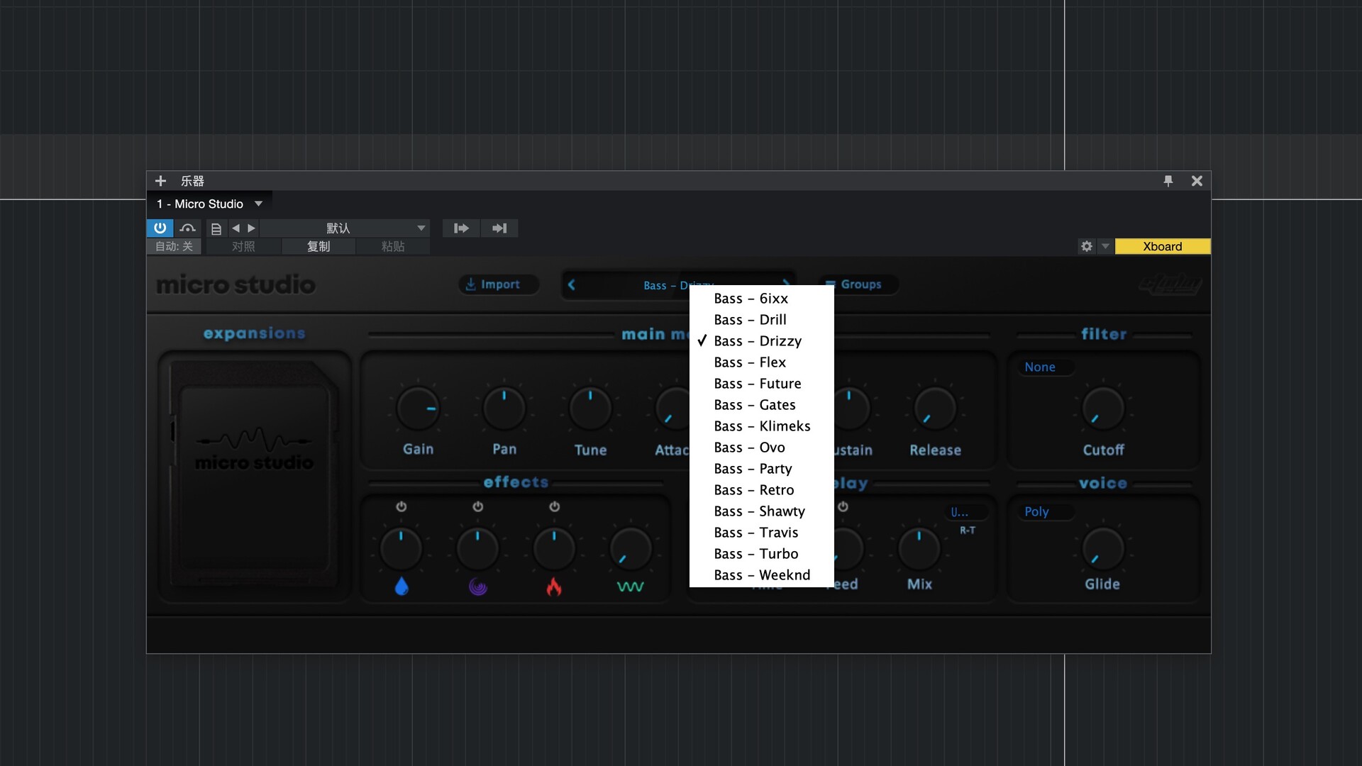 Studio 内置效果器包括 ADSR、LFO 深度、LFO 速率、混响、滑音、音高、宽度、截止频率和声音模式。这些效果器让您可以完全根据自己的喜好调整和自定义声音。