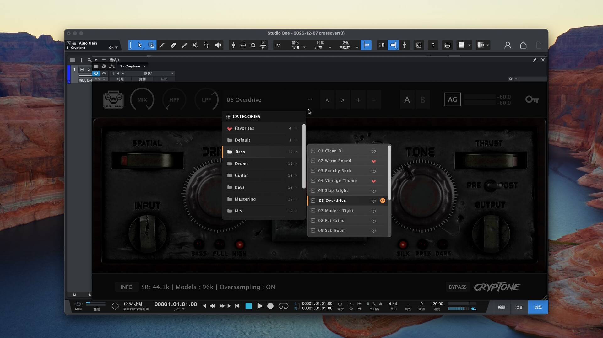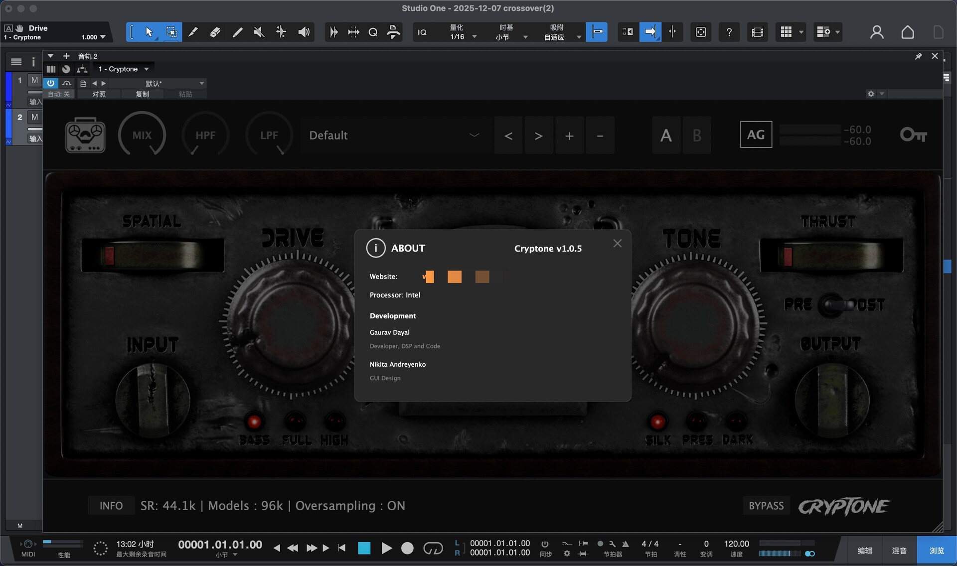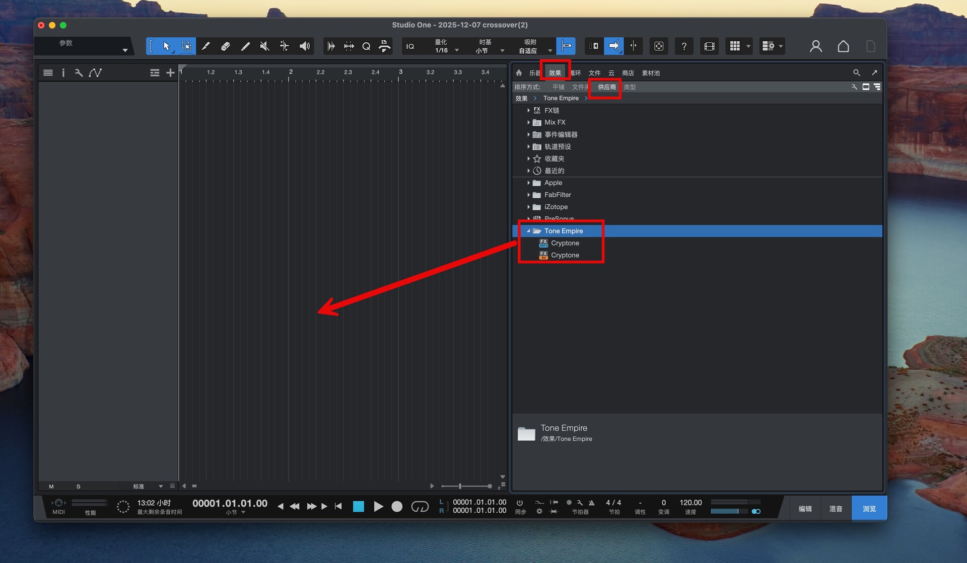 打开studio one 在效果-供应商找到安装好的Cryptone 插件,拖到左侧音轨处即可使用如图