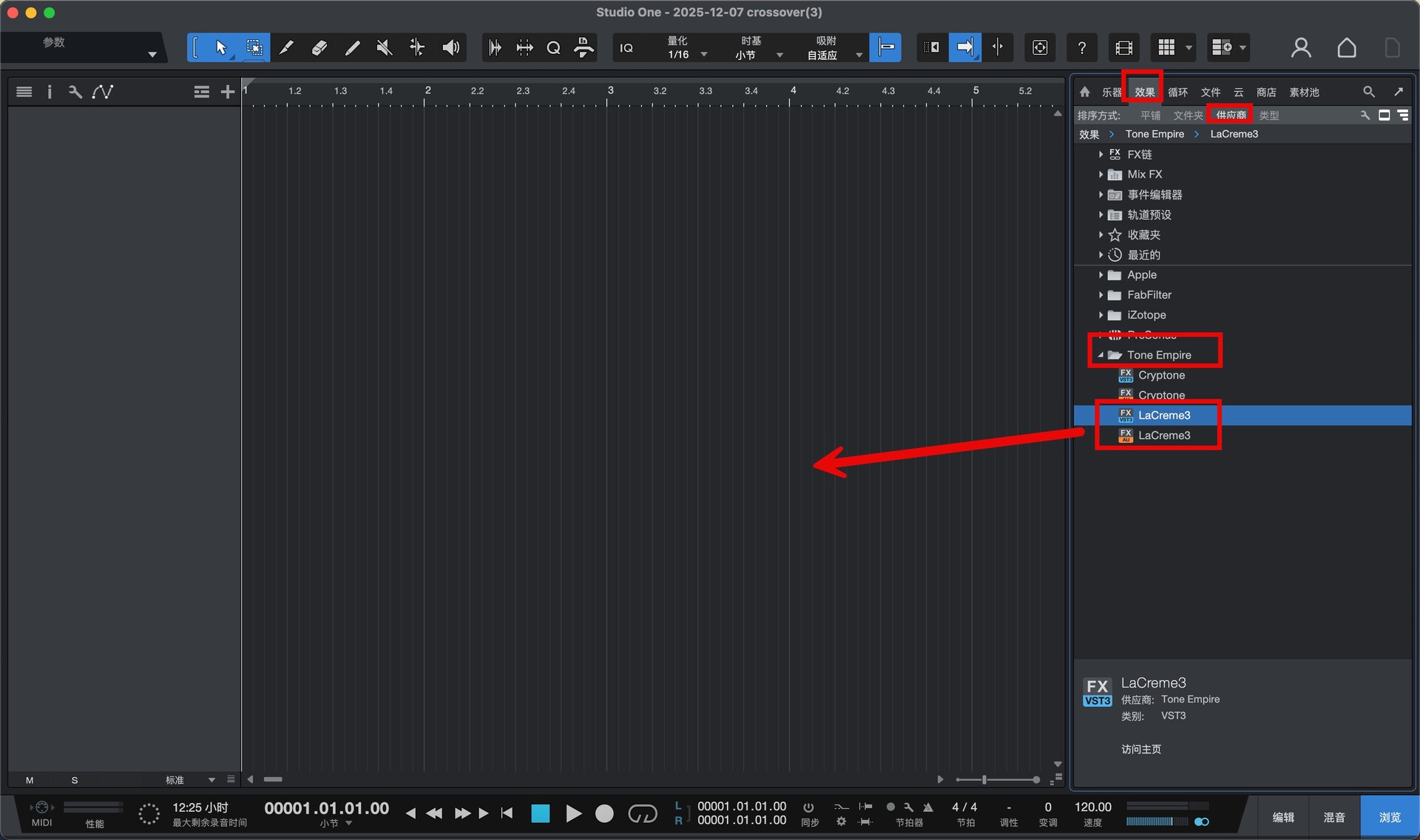 打开studio one 在效果-供应商找到安装好的LaCreme插件,拖到左侧音轨处即可使用如图