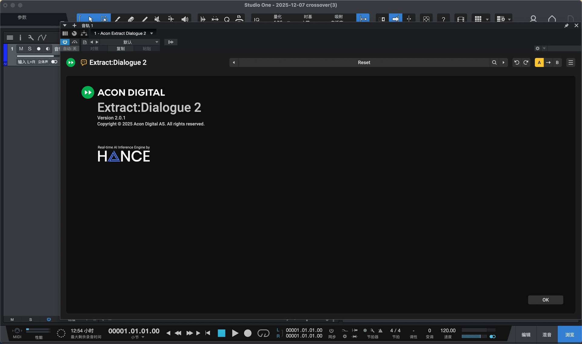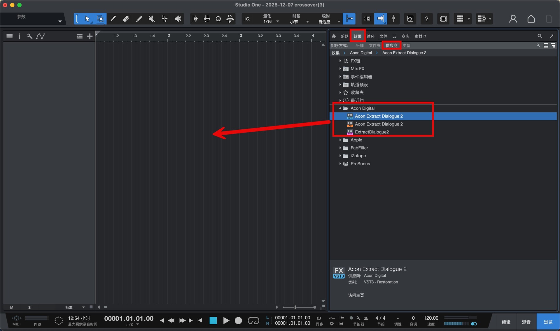 打开studio one 在效果-供应商找到安装好的 Extract Dialogue 2 插件,拖到左侧音轨处即可使用如图
