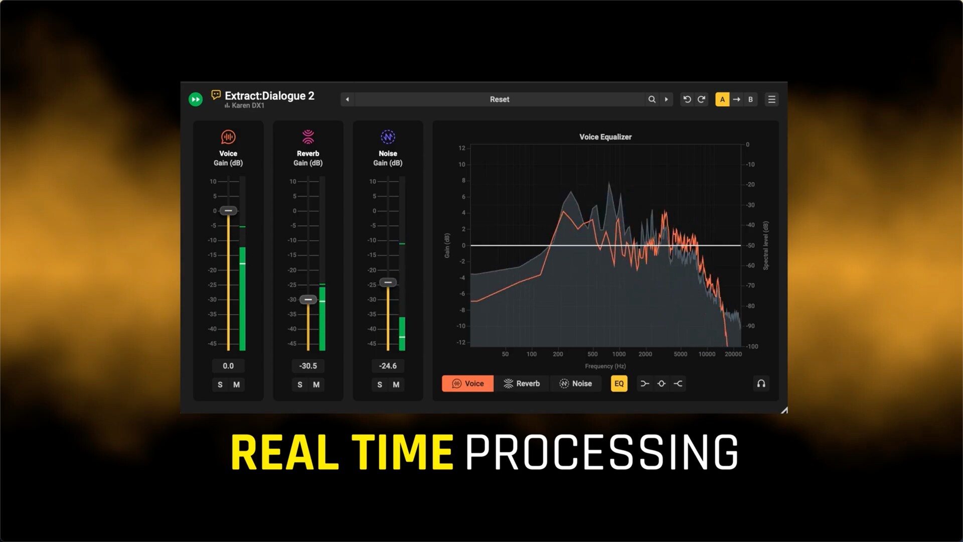 实时频谱显示将信号的每个部分可视化。不同的颜色叠加层分别显示人声、混响和噪声成分,而独奏和静音按钮则方便用户准确地听到正在发生的事情。