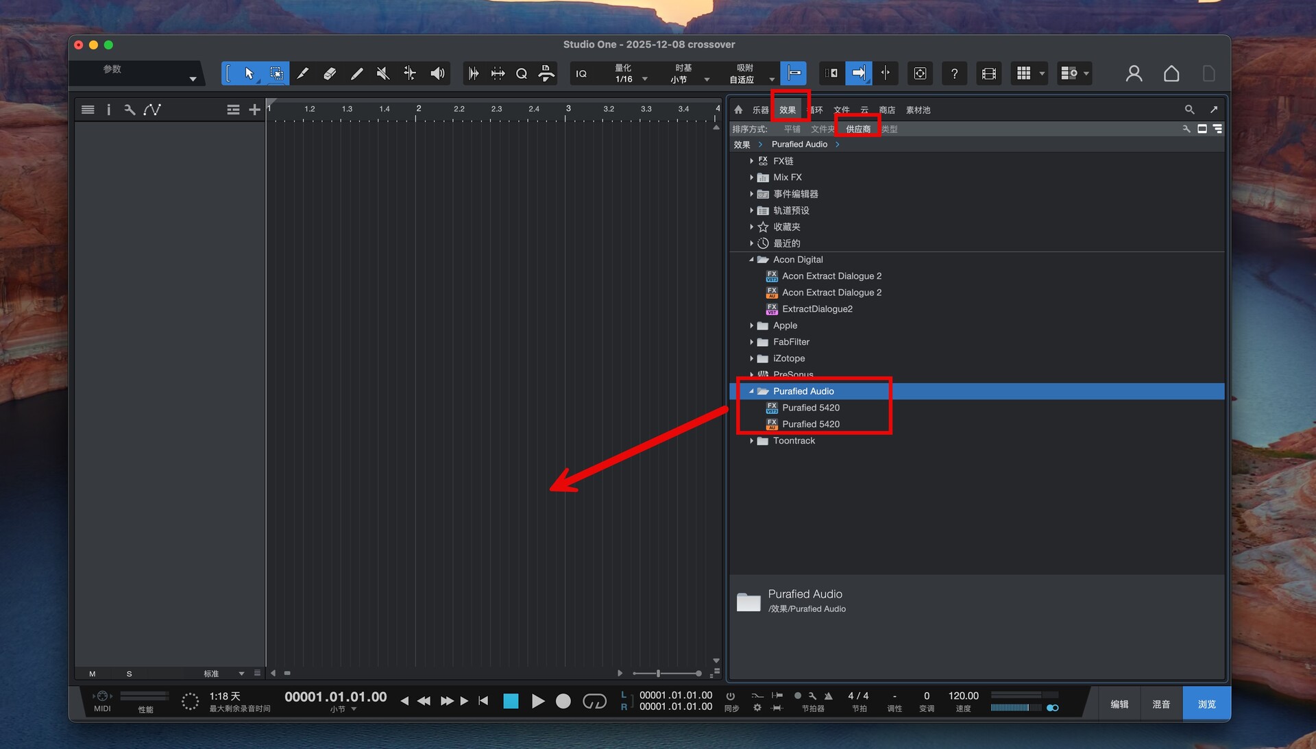 打开studio one,在效果-供应商找到安装好的Purafied 5420插件,拖动到左侧音轨处即可,如图
