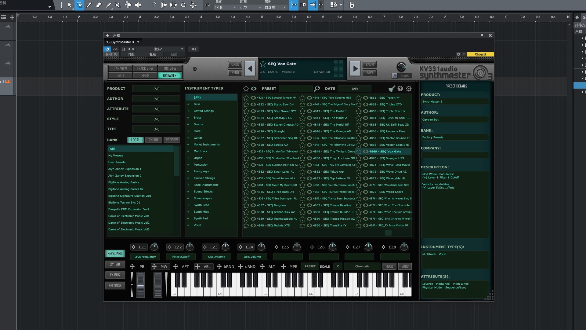 SynthMaster 3 拥有直观的预设浏览器和高级搜索功能。预设可以按产品、作者、音色库、乐器类型、属性、风格(流派)和预设名称进行筛选: