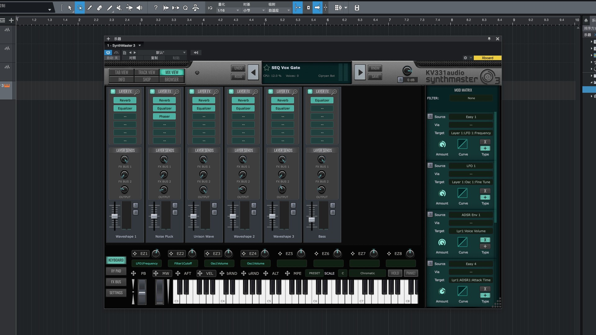 音轨视图:此视图用于编辑多个图层的键盘区域、力度区域、和声、齐奏、琶音器和音序器参数:
