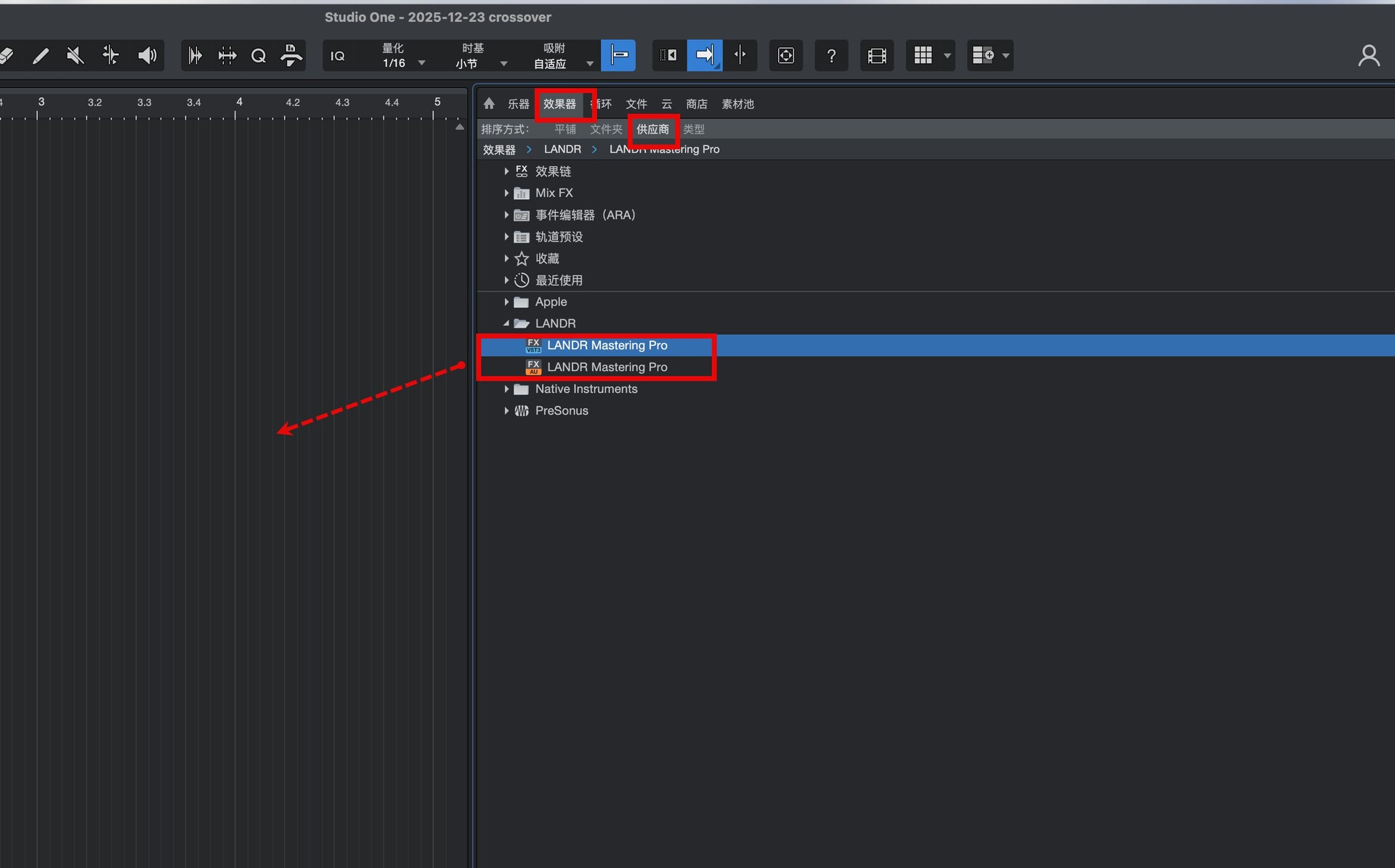 打开Studio One,在效果—供应商中找到安装好的插件,拖到软件空白处即可开始使用