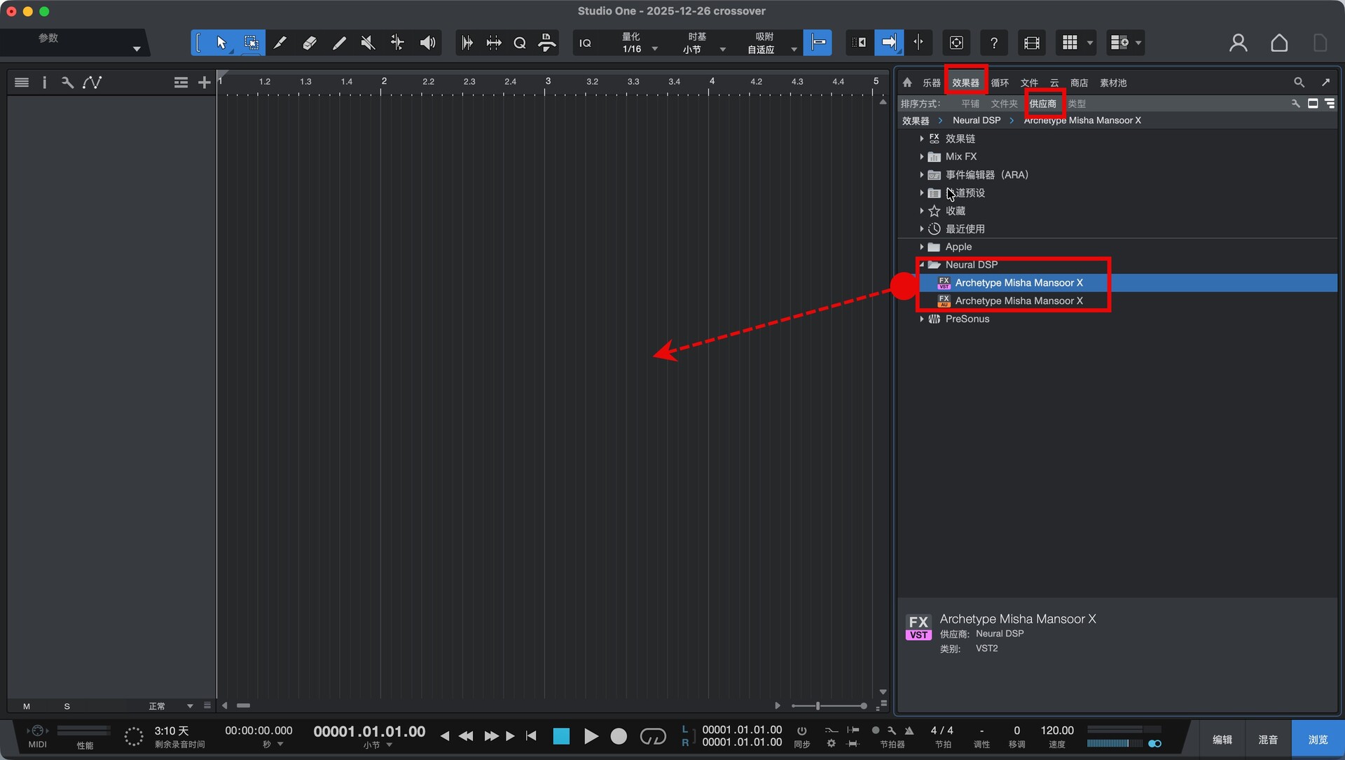 打开Studio One,在效果—供应商中找到安装好的插件,拖到软件空白处即可开始使用