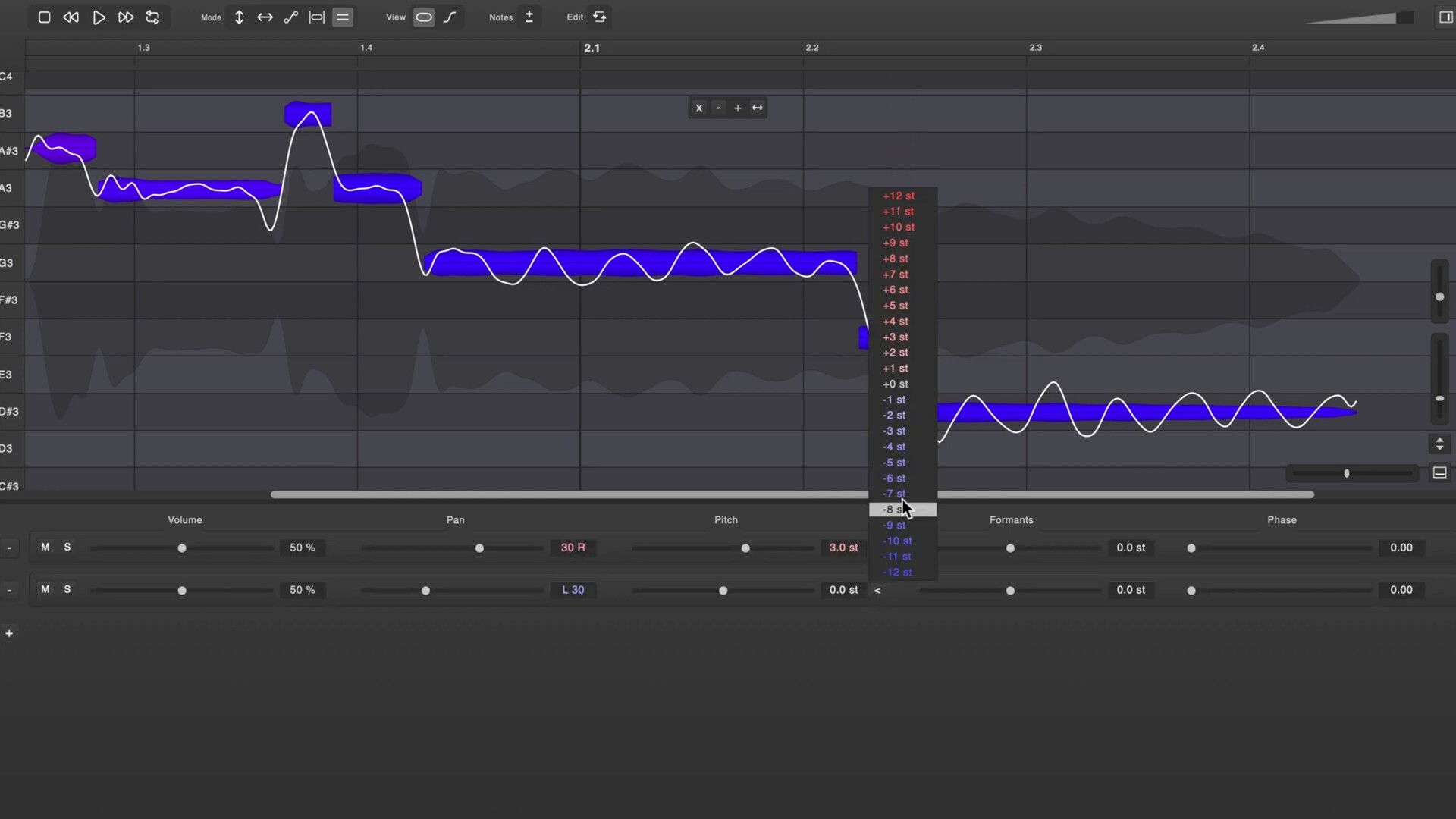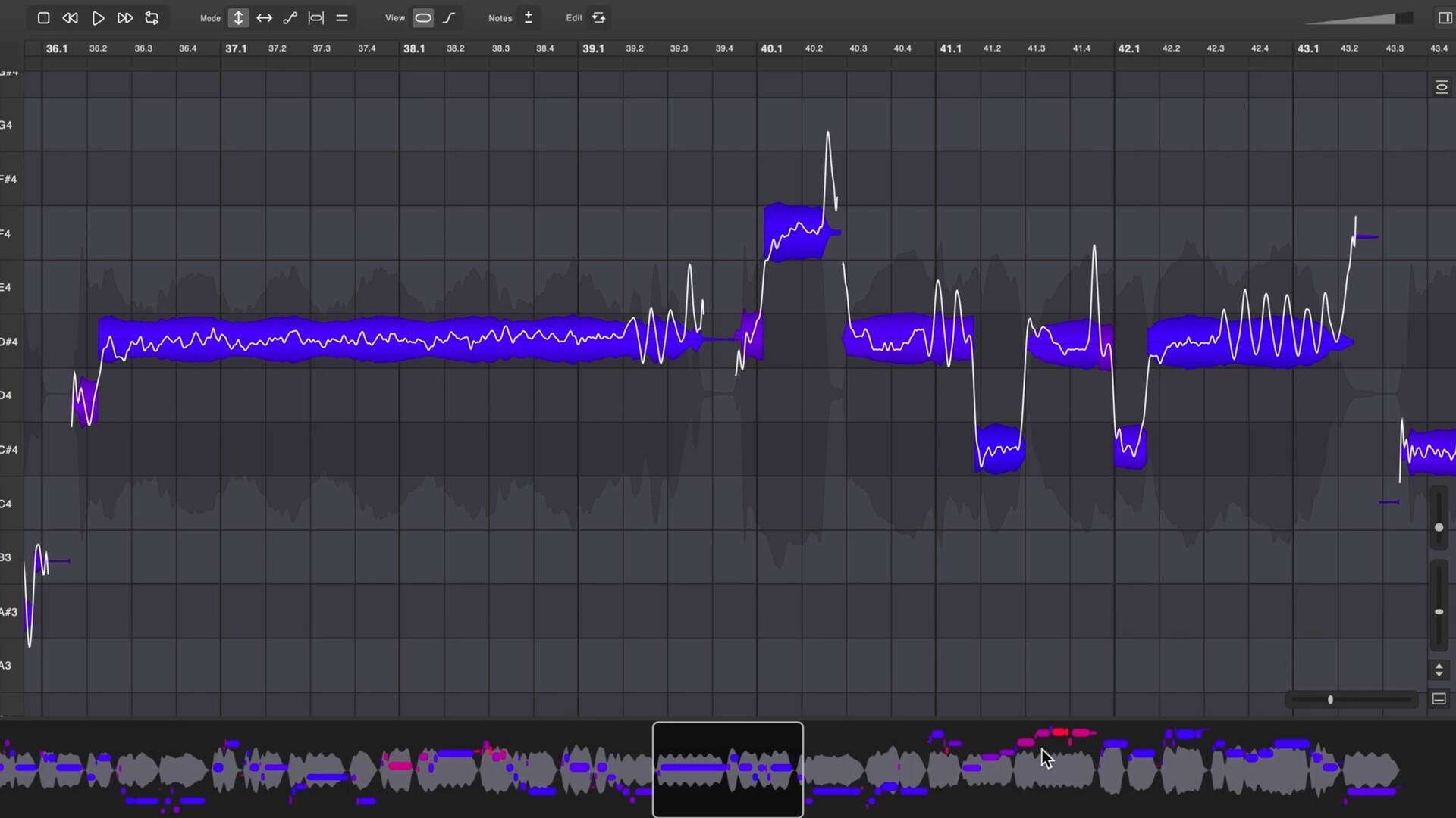 音符的颜色会显示与正确音高的偏差,以便您更好地确定校正的起点。