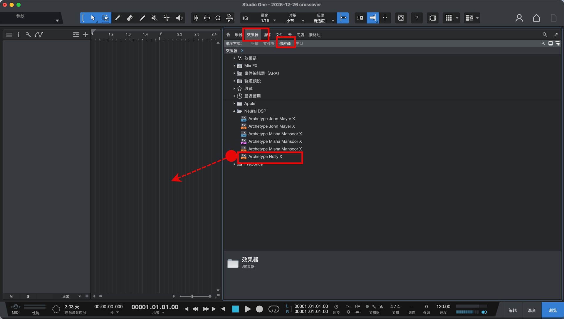 打开Studio One,在效果—供应商中找到安装好的插件,拖到软件空白处即可开始使用