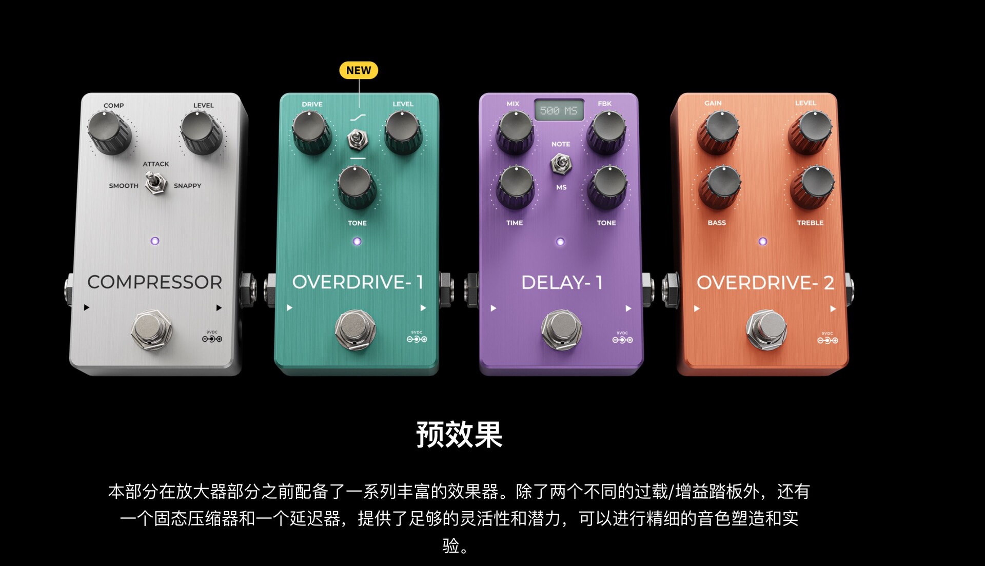 - 本部分包含丰富的效果器,位于放大器部分之前。除了两个不同的过载/增益踏板外,还有一个固态压缩器和一个延迟器,提供了足够的灵活性和潜力,可以进行精细的音色塑造和实验。