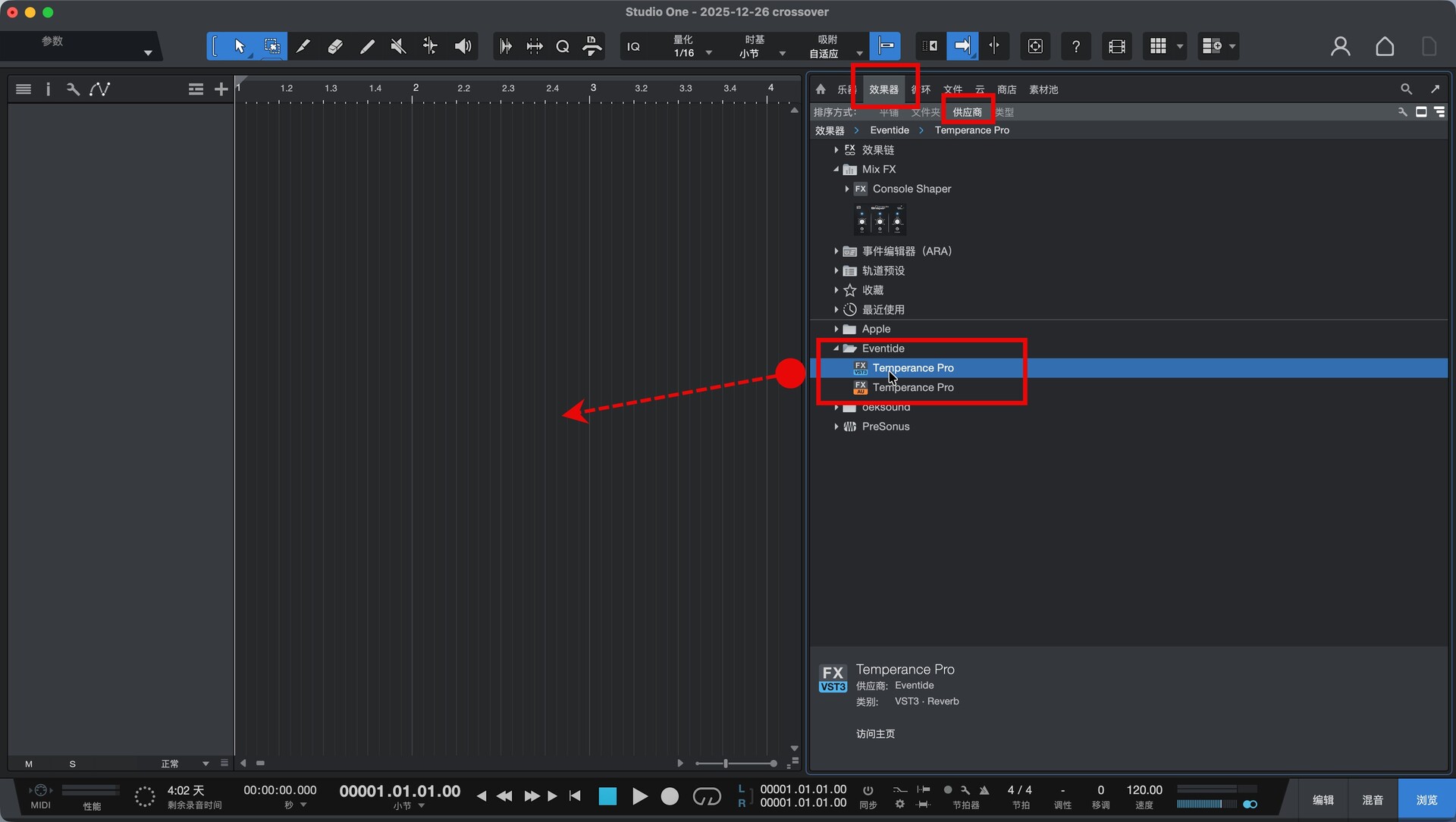 打开Studio One,在效果—供应商中找到安装好的插件,拖到软件空白处即可开始使用