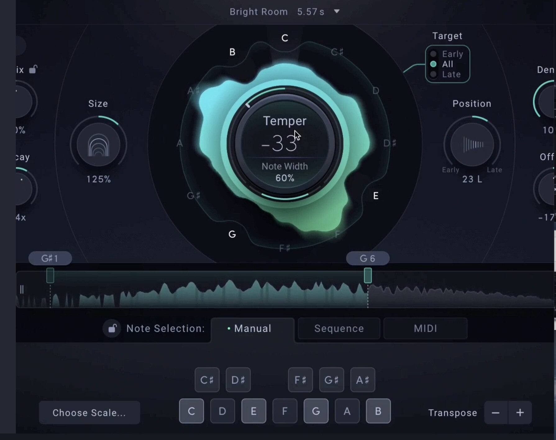 音律和范围控制可以调节混响的音乐性,调整应用于所选音符的强调或去强调程度,并选择要进行音律控制的八度音程。