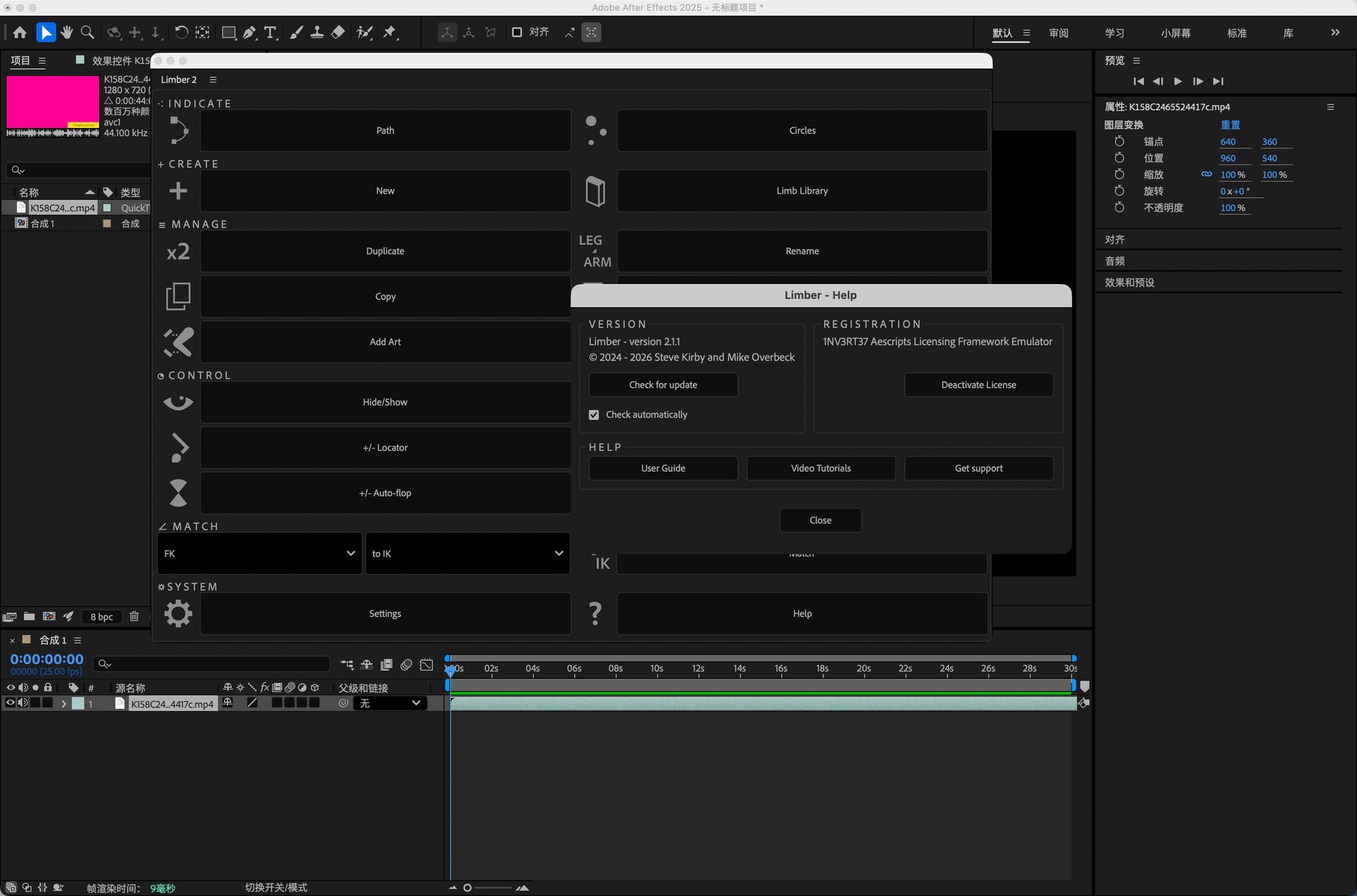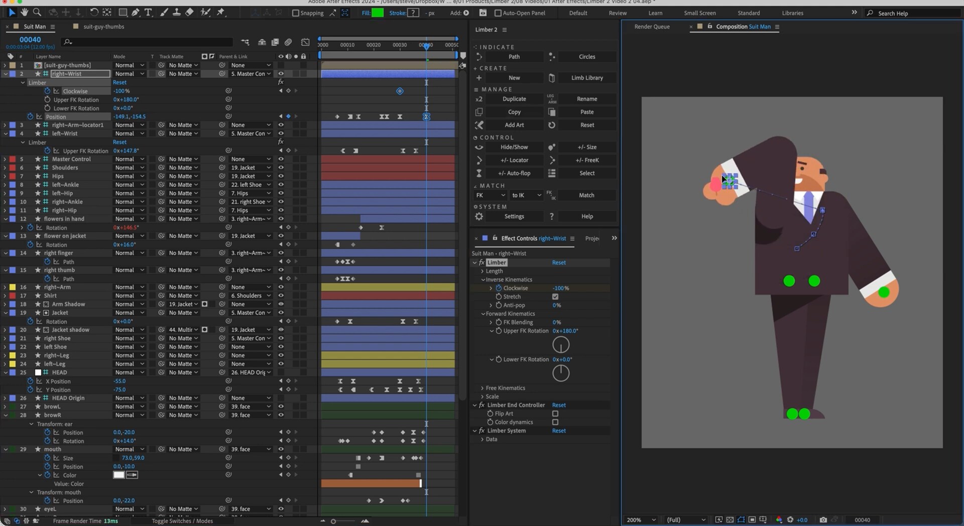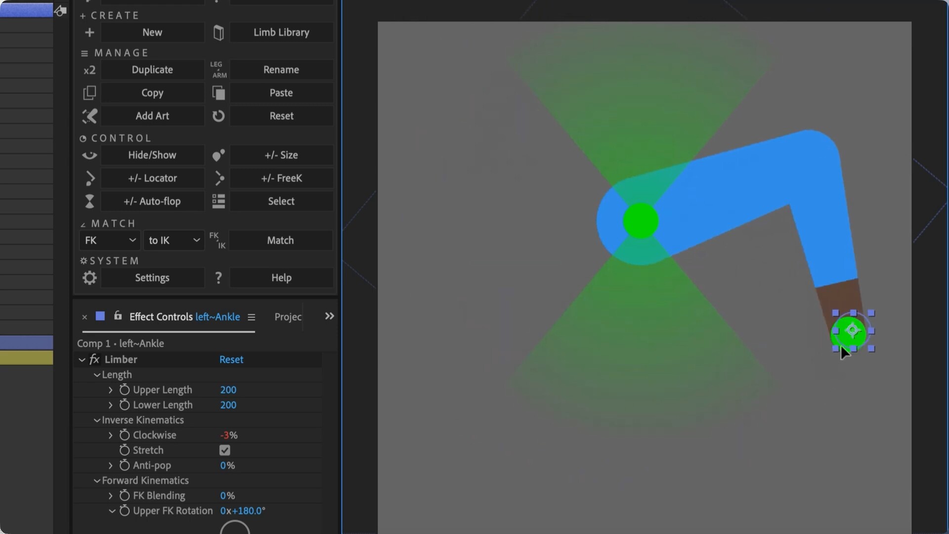 Limber 2 功能齐全:矢量艺术、光栅艺术、弯曲路径、木偶针、仿 3D 锥度以及Limb 库中的 100 多个预设。Limber是一个用于After Effects的IK系统,它使用形状图层为角色动画制作可定制的肢体。Limber有控制样式的形状和颜色,动态防止动画“弹出”,顺利地融合之间的IK和FK,并交换四肢的不同类型。