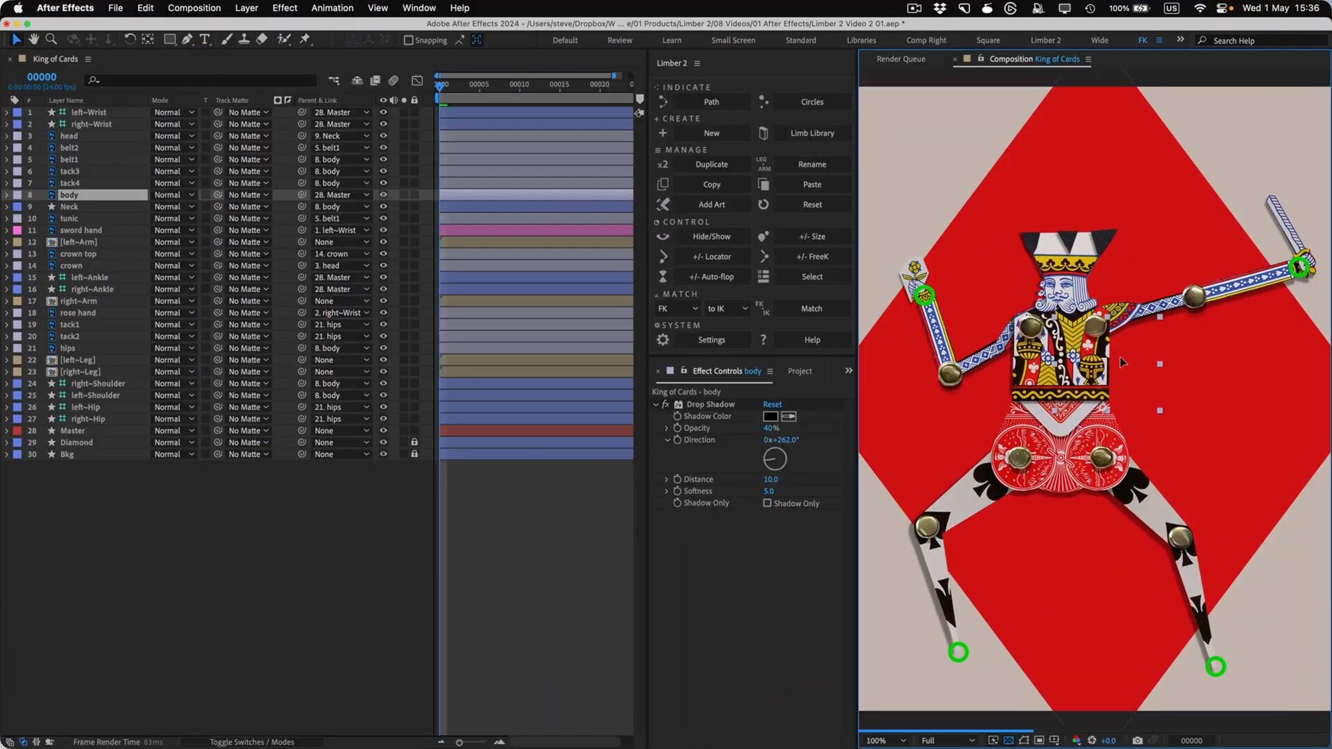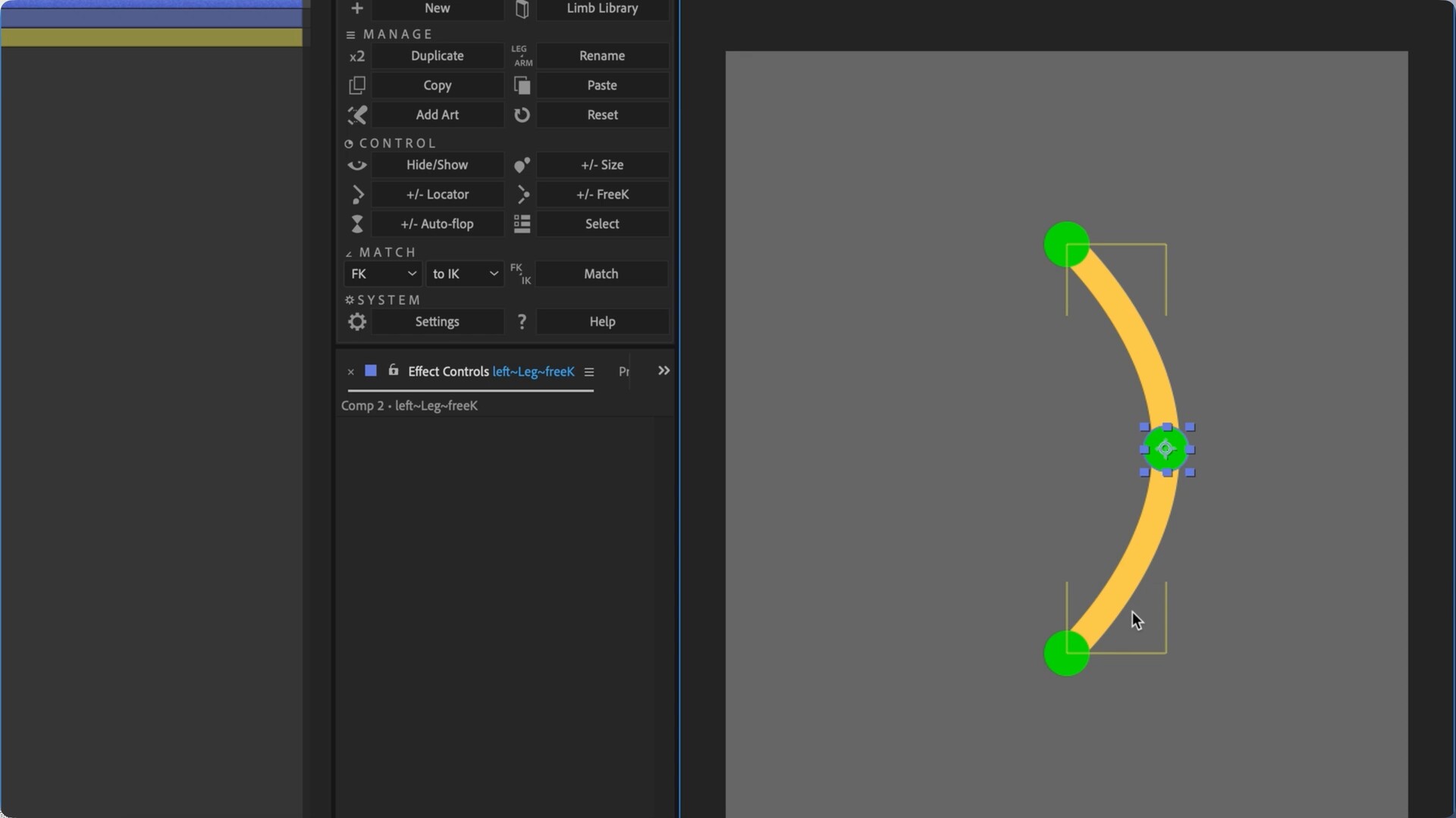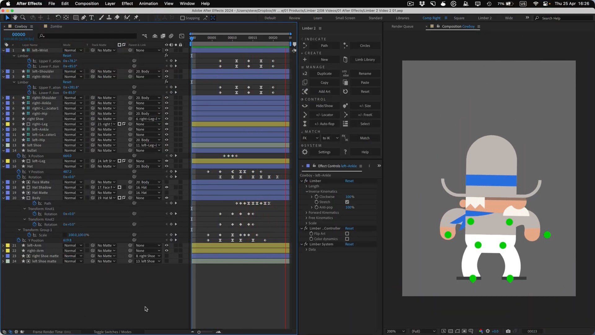Limber 2 功能齐全:矢量艺术、光栅艺术、弯曲路径、木偶针、仿 3D 锥度以及Limb 库中的 100 多个预设。Limber是一个用于After Effects的IK系统,它使用形状图层为角色动画制作可定制的肢体。Limber有控制样式的形状和颜色,动态防止动画“弹出”,顺利地融合之间的IK和FK,并交换四肢的不同类型。