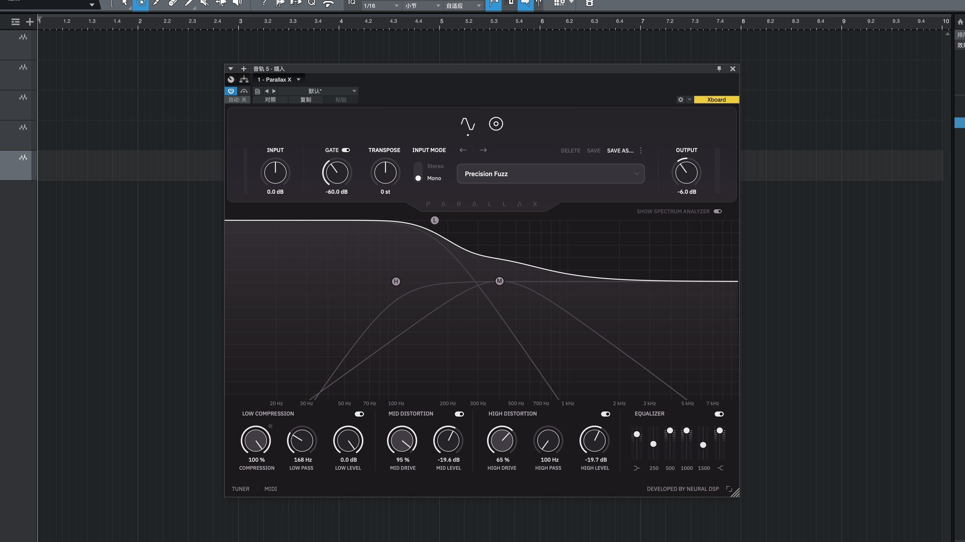 移调:将吉他的音高按固定的音程(+12/-12 个半音)升高或降低。使用此功能可以轻松改变乐器的音调。