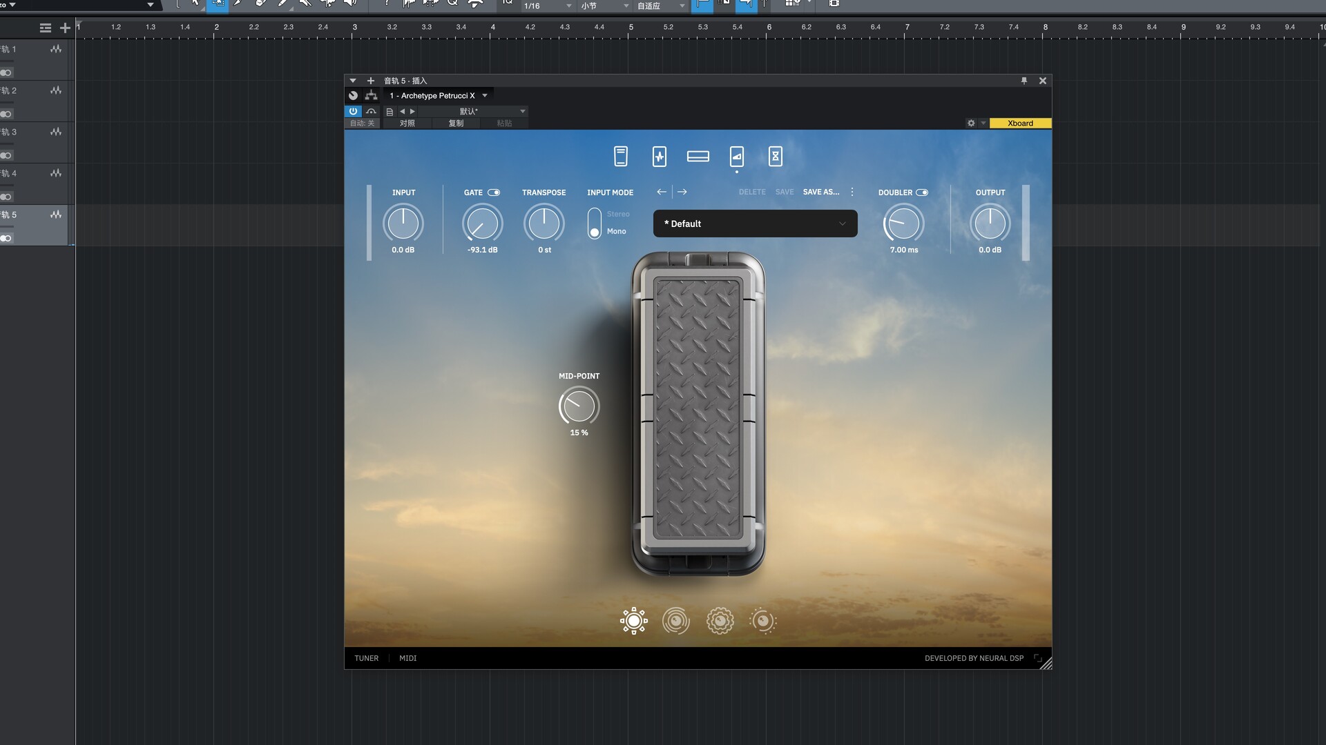 移调:将吉他的音高按固定的音程(+12/-12 个半音)升高或降低。使用此功能可以轻松改变乐器的音调。
