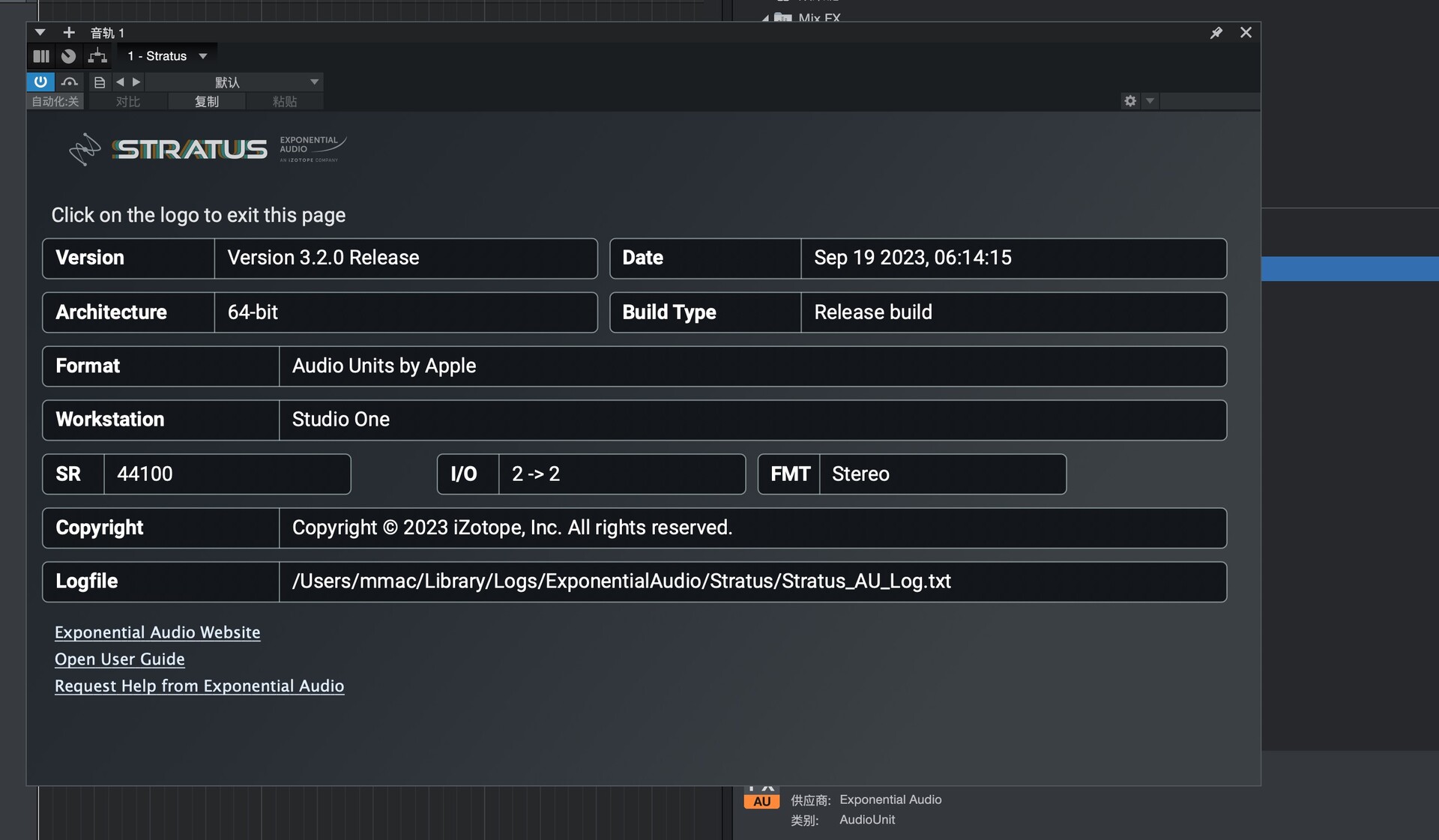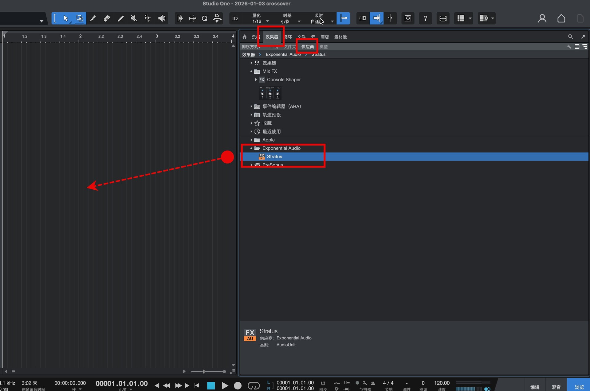 打开studio one,在效果-供应商中就可以找到Stratus插件,将其拖动至左侧空白位置