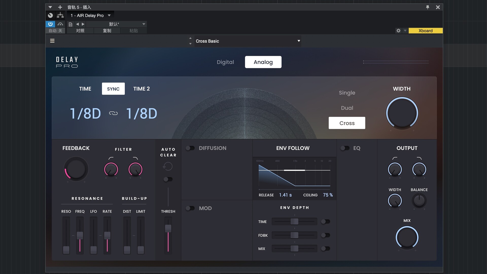 包络跟随功能允许您控制延迟随时间的变化。您可以控制延迟时间、反馈和混音随时间的变化,并通过设置上限和释放时间来控制变化的时机。