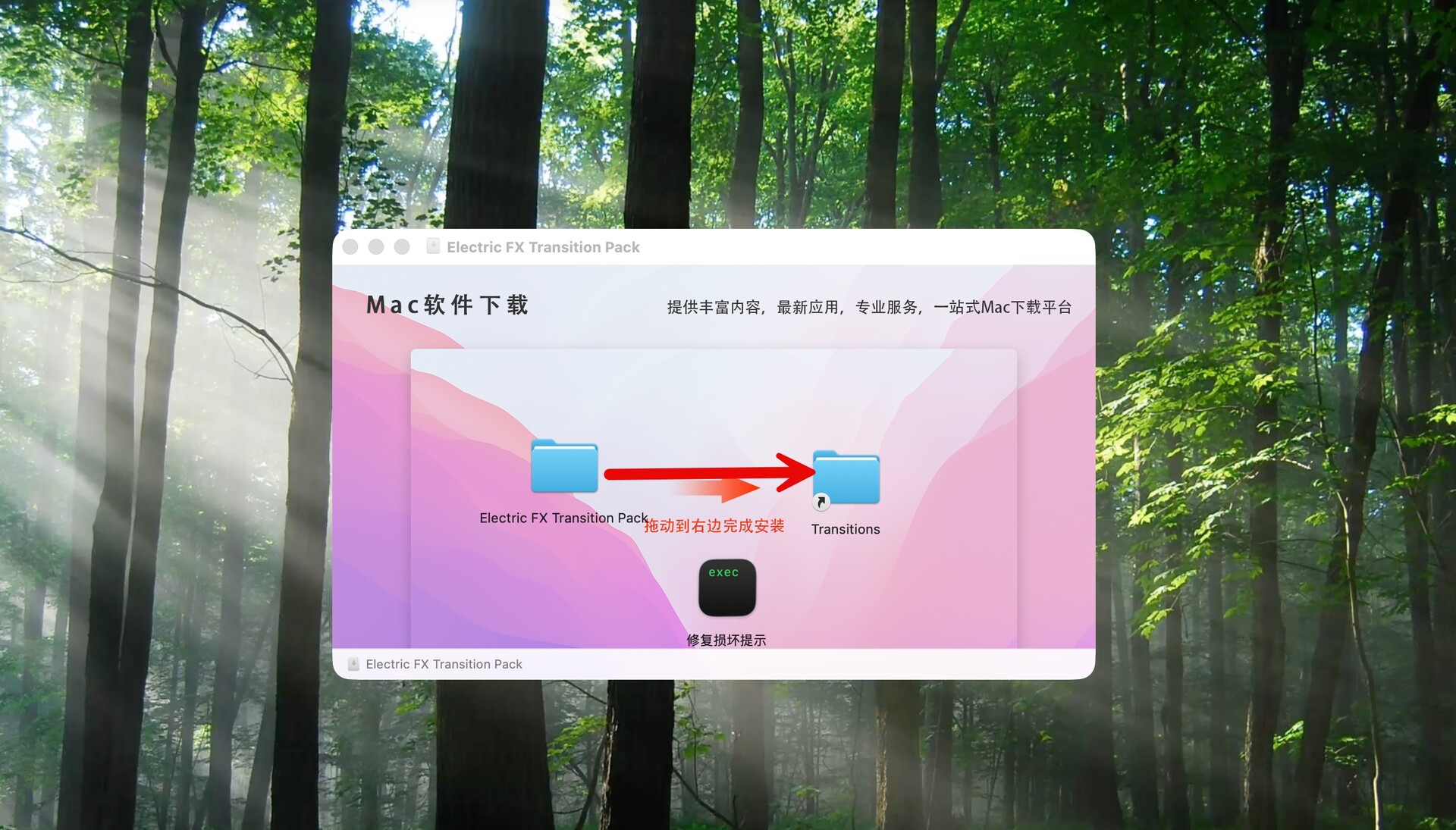 打开fcpx软件,在已安装的转场中,可以看到安装好的fcpx插件Electric FX Transition Pack