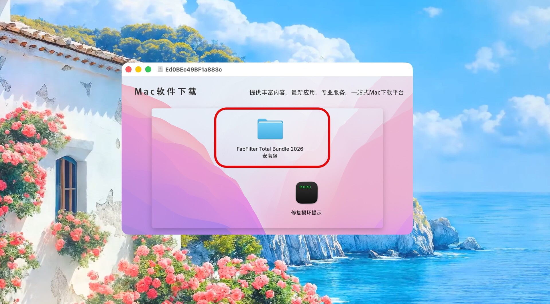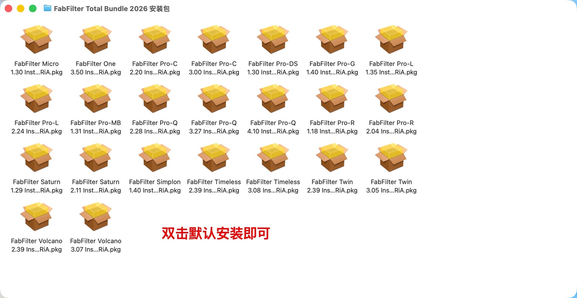 测试环境:M1 Mac 26.2系统 studio one 7安装包下载完成后,打开里边的的FabFilter Total Bundle 2026 安装包,如图